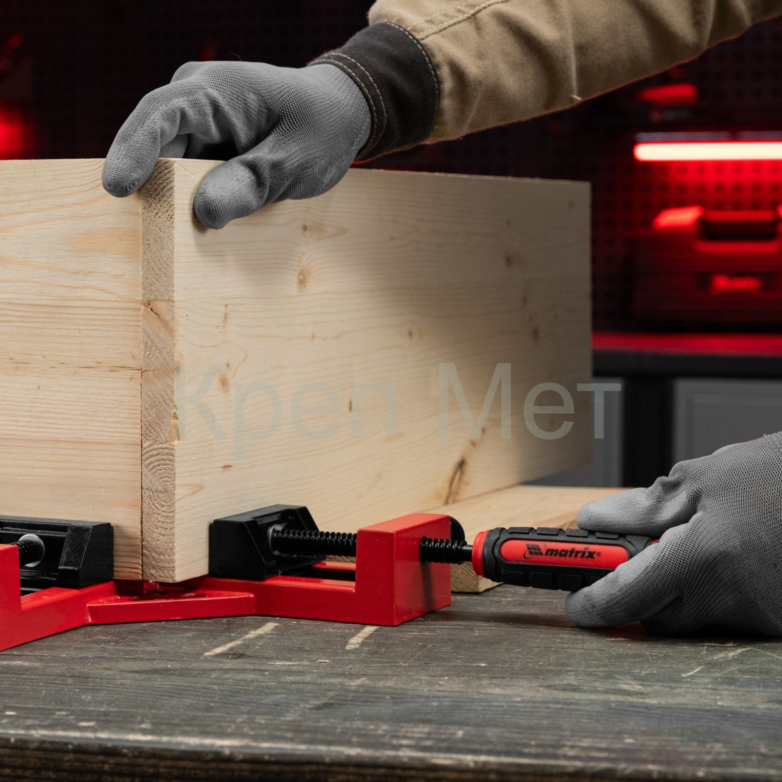 Угловая быстрозажимная струбцина Matrix 20322 с шириной зажима 65 х 65 мм, с двухкомпонентными обрезиненными рукоятками, предназначена для быстрой и надежной фиксации заготовок перпендикулярно друг другу. Рычажно-осевой механизм не требует особых усилий от пользователя. Инструмент позволяет точно выдерживать угол в 90°, обеспечивая высокое качество работ. Струбцину используют для сборки мебели и других конструкций.
