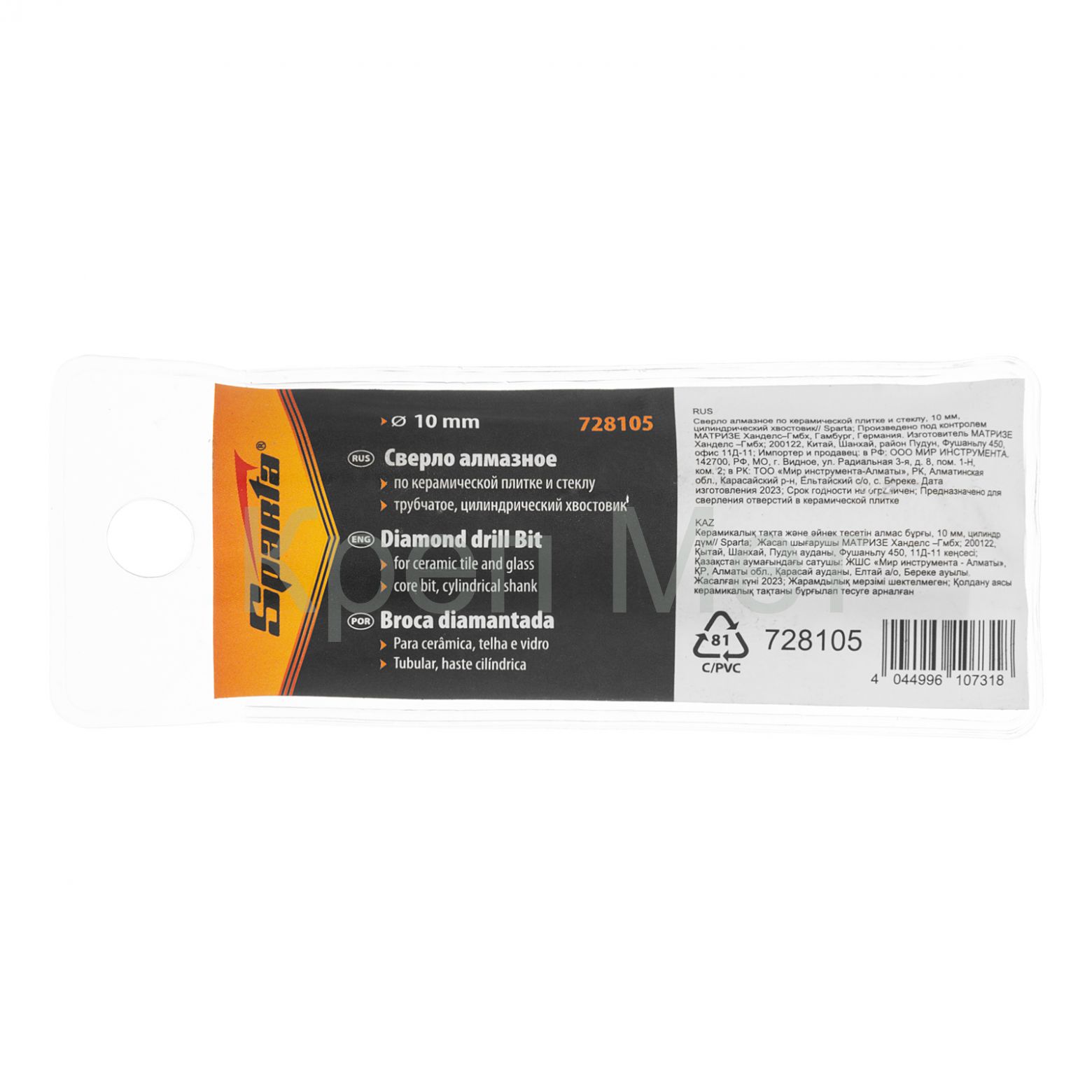 - Сверло алмазное по керамической плитке и стеклу, 10 мм, цилиндрический хвостовик Sparta