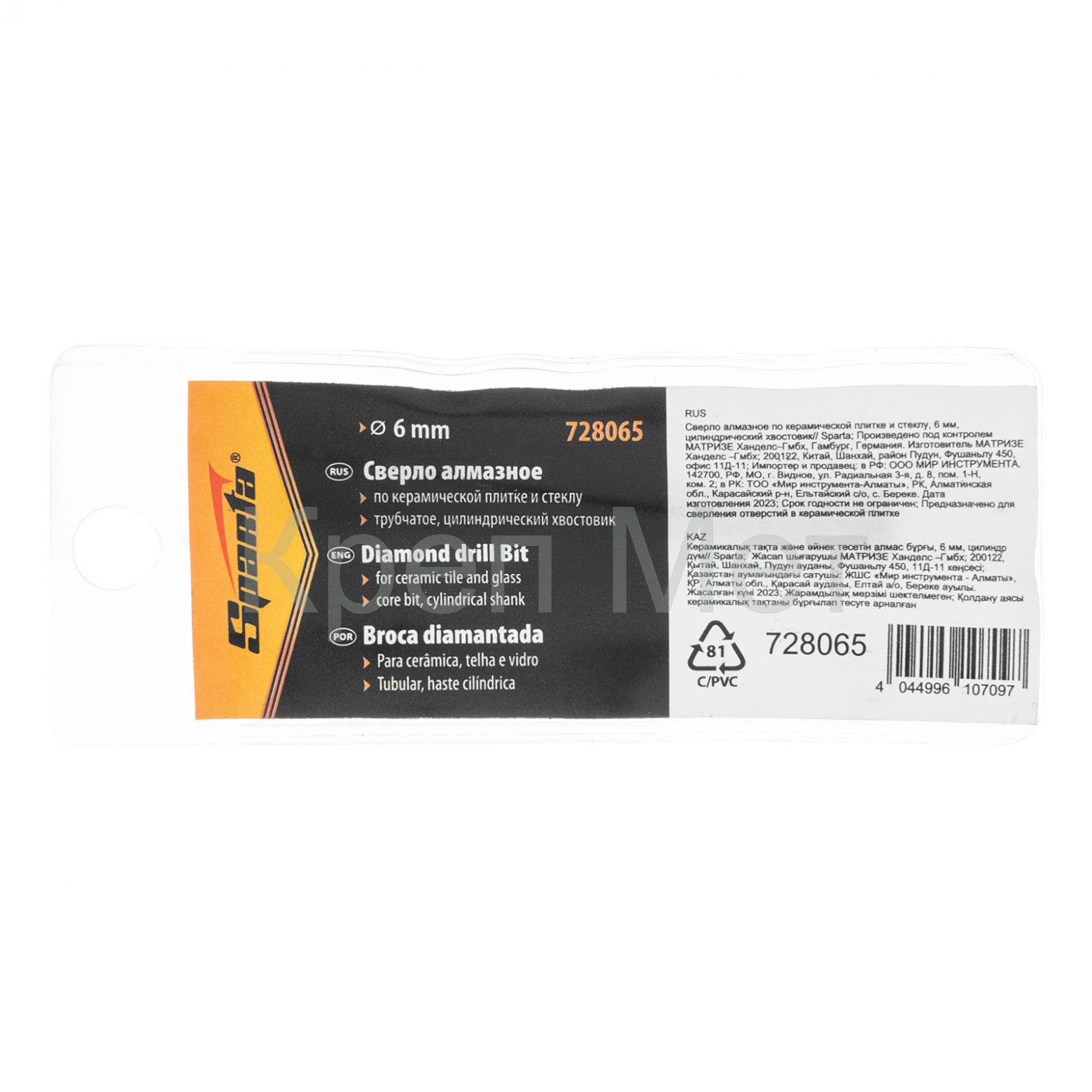 Сверло алмазное по керамической плитке и стеклу, 6 мм, цилиндрический хвостовик Sparta