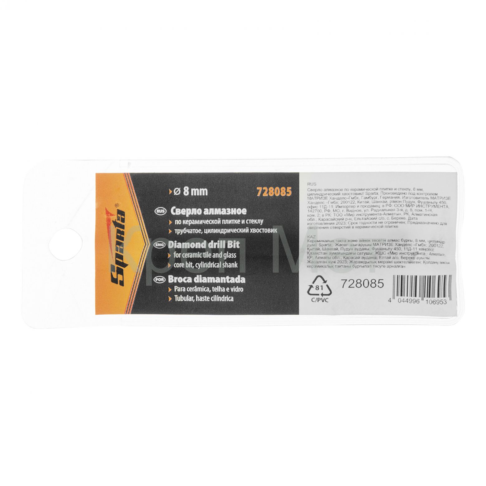 - Сверло алмазное по керамической плитке и стеклу, 8 мм, цилиндрический хвостовик Sparta