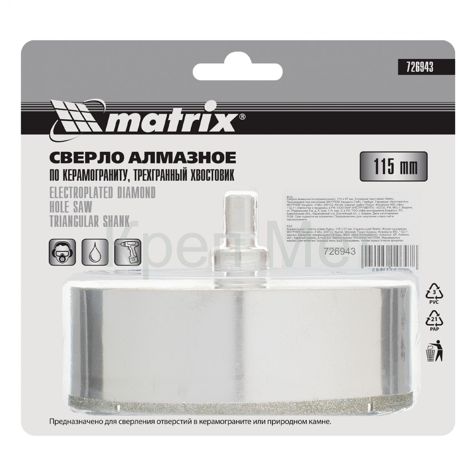 - Сверло алмазное по керамограниту, 115 х 67 мм, трехгранный хвостовик Matrix