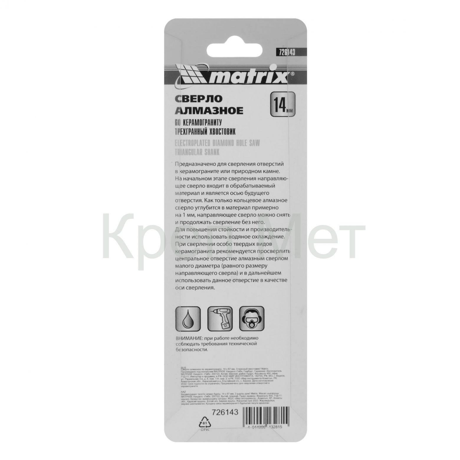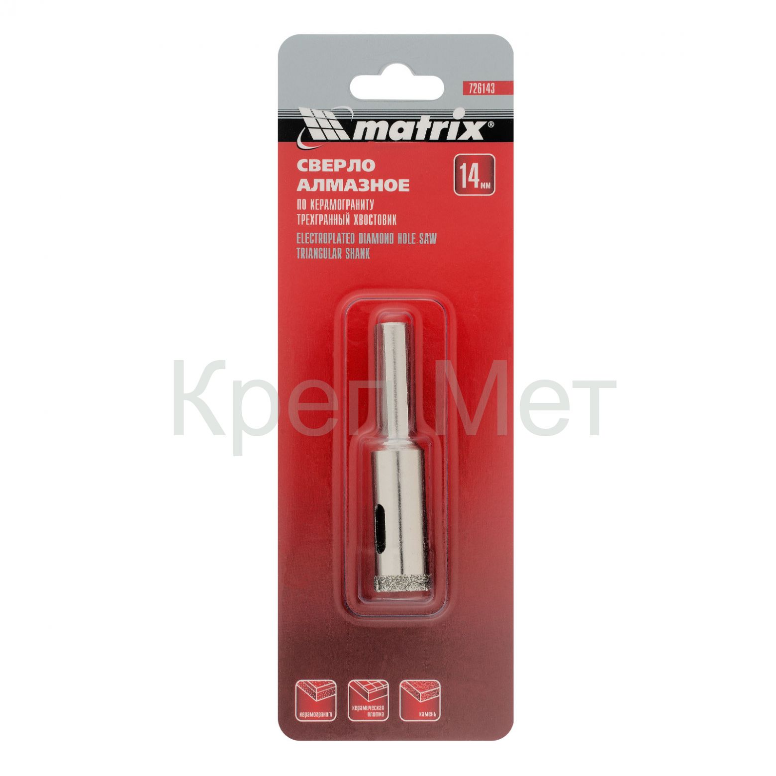 - Сверло алмазное по керамограниту, 14 х 67 мм, трехгранный хвостовик Matrix