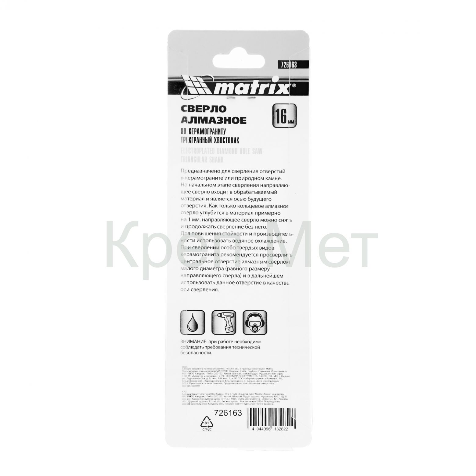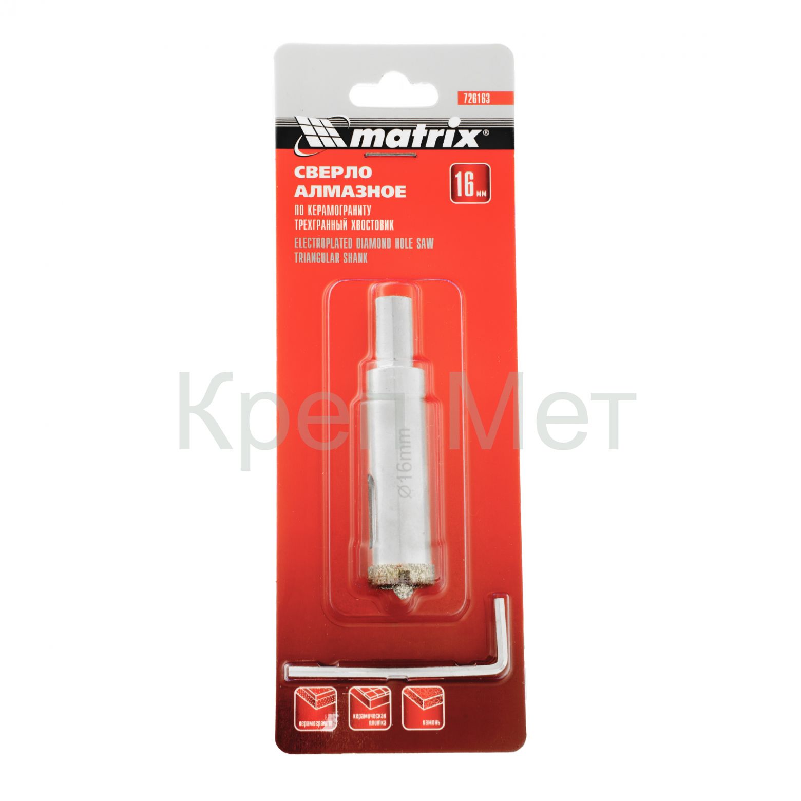 - Сверло алмазное по керамограниту, 16 х 67 мм, трехгранный хвостовик Matrix