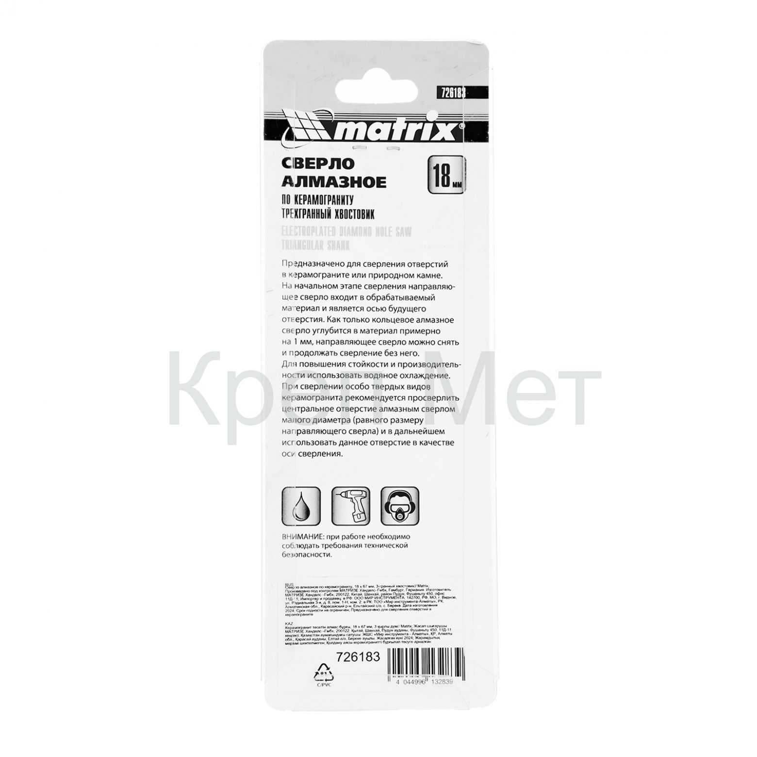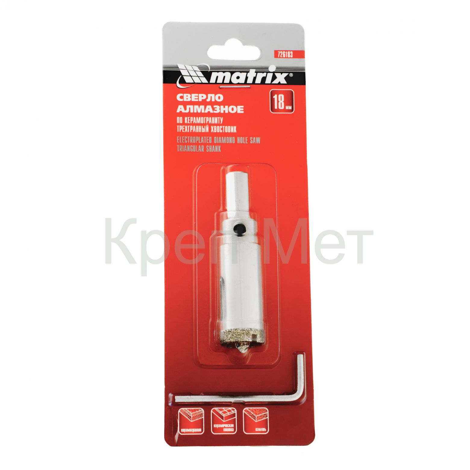 - Сверло алмазное по керамограниту, 18 х 67 мм, трехгранный хвостовик Matrix