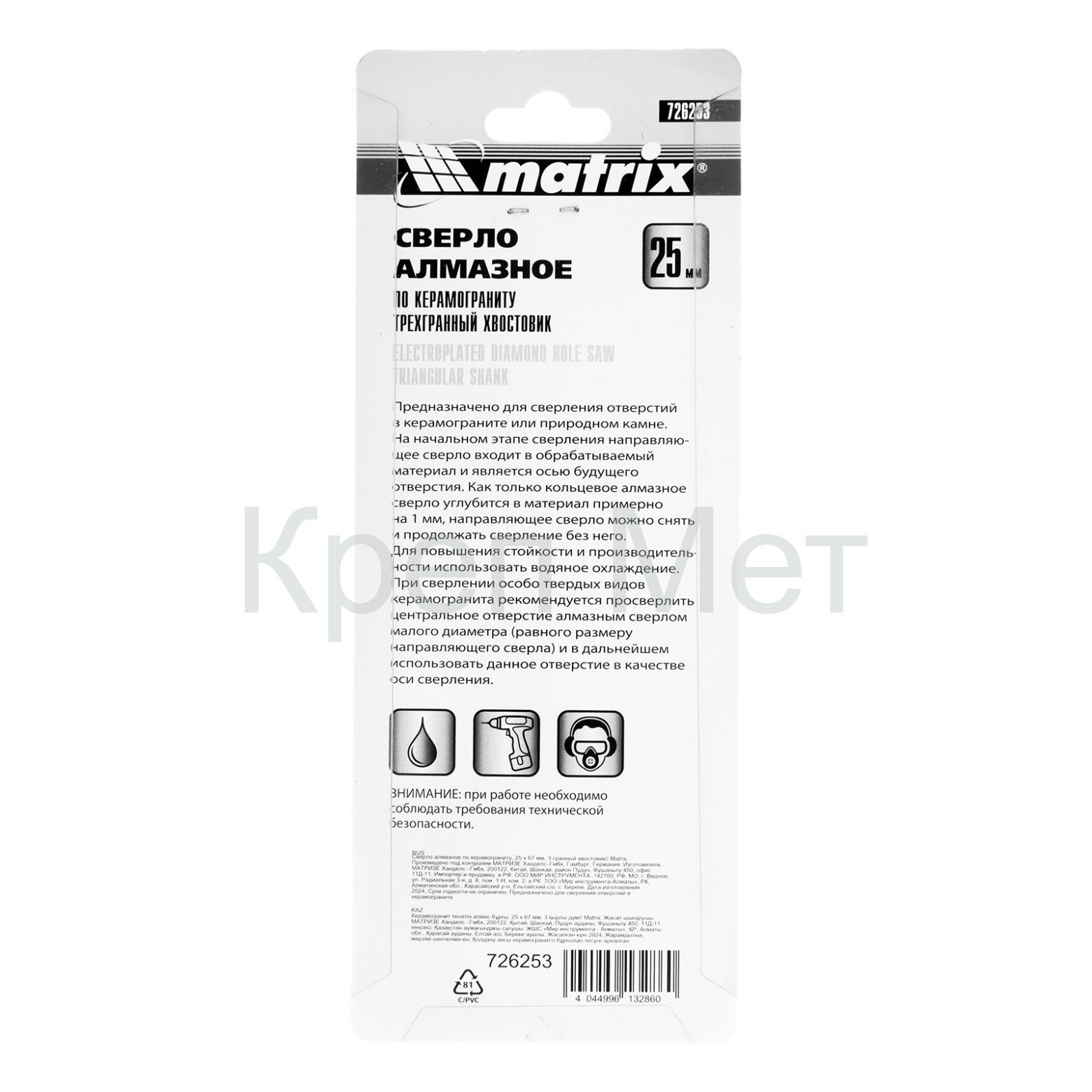 - Сверло алмазное по керамограниту, 25 х 67 мм, трехгранный хвостовик Matrix
