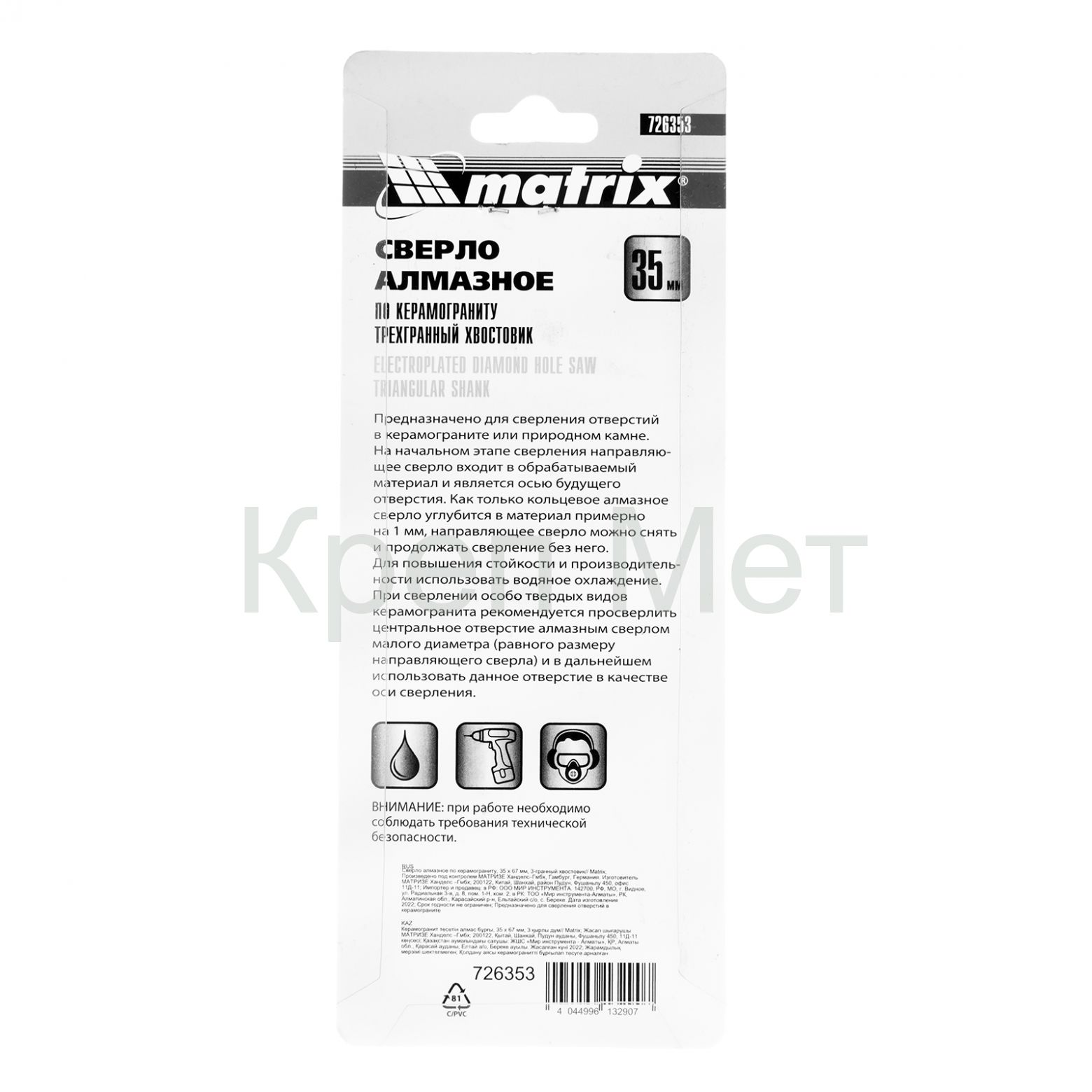 Сверло алмазное по керамограниту, 35 х 67 мм, трехгранный хвостовик Matrix