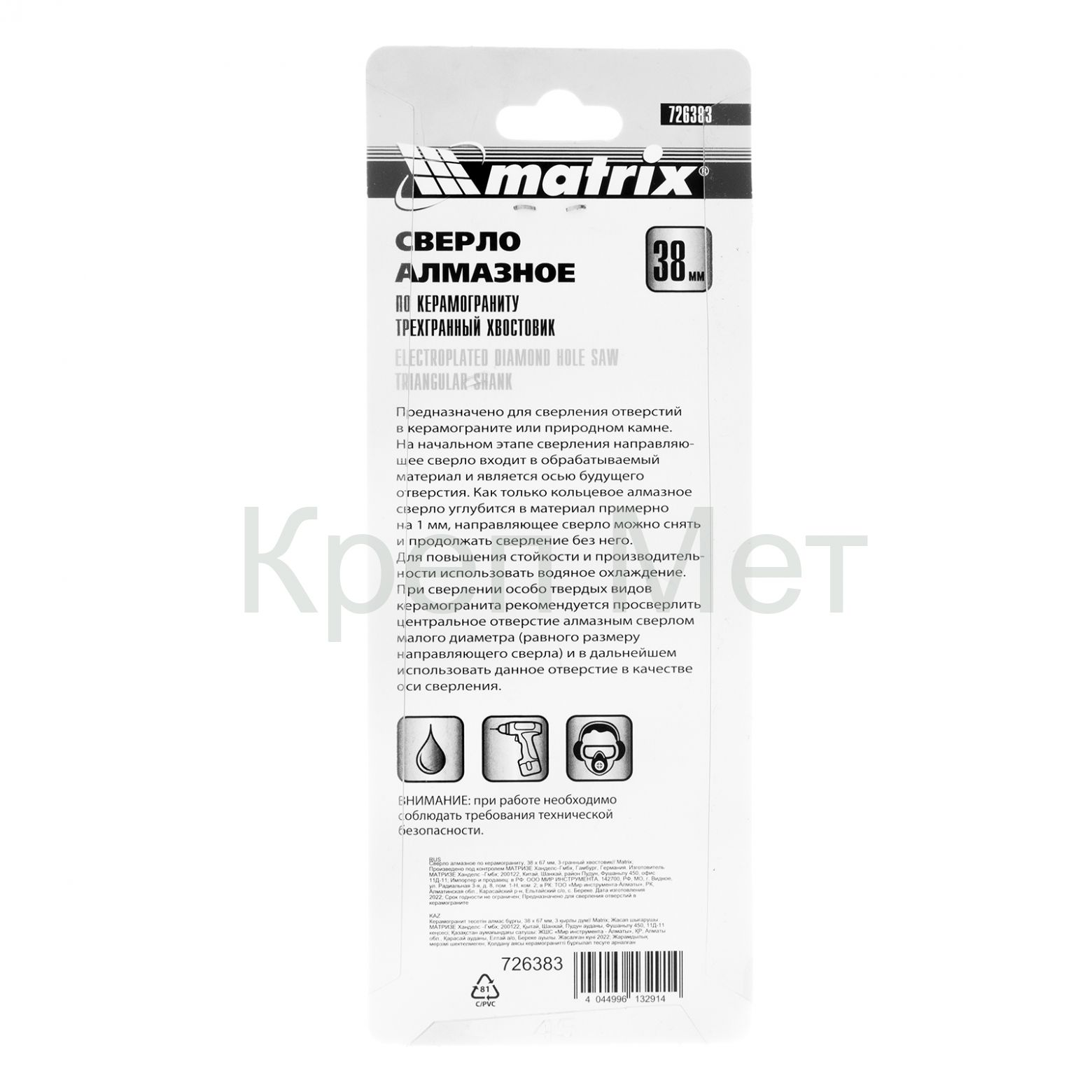 - Сверло алмазное по керамограниту, 38 х 67 мм, трехгранный хвостовик Matrix