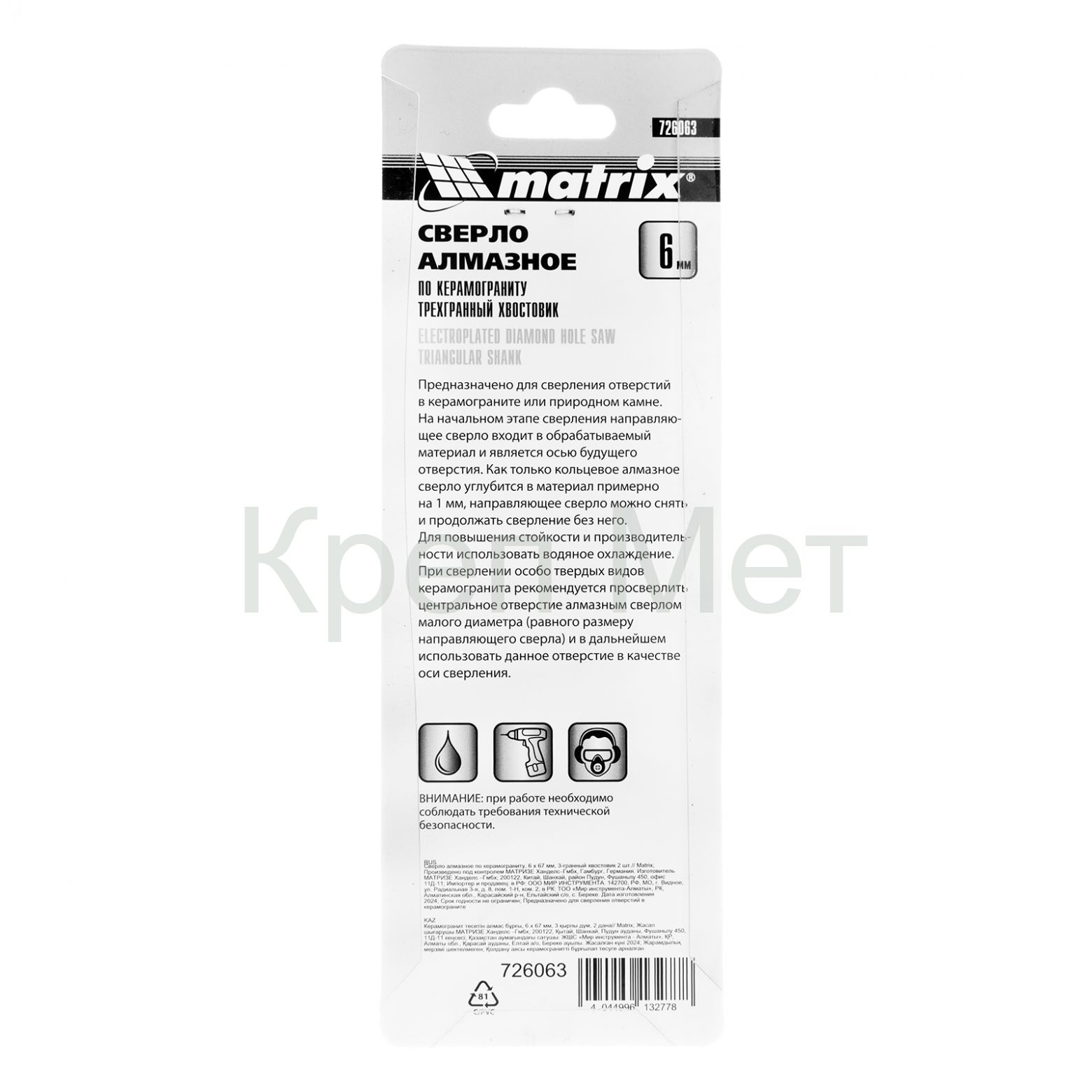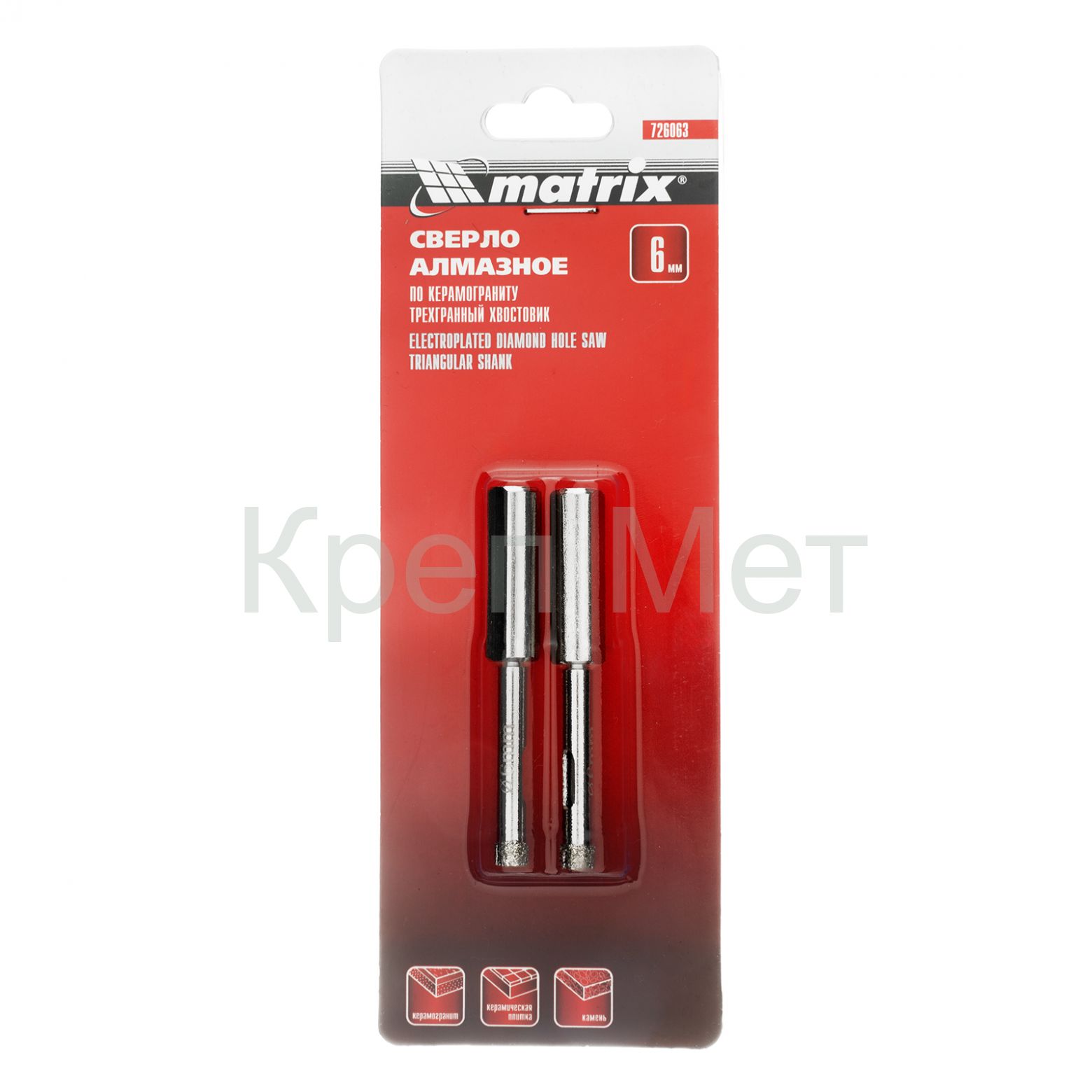 - Сверло алмазное по керамограниту, 6 х 67 мм, трехгранный хвостовик, 2 шт Matrix