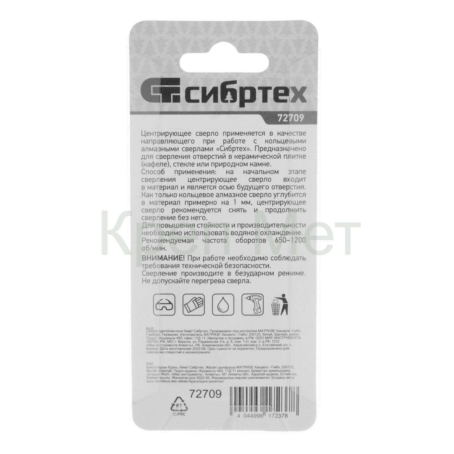 Центровочное сверло Сибртех 72709 диаметром 6 мм предназначено для использования с алмазными коронками Сибртех 72716-72738. Устанавливается в патрон дрели или шуруповерта. Применяется для сверления стекла и керамической плитки на скорости 350-700 об/мин. Сверло быстро заглубляется в материал и удерживает коронку на оси сверления. В целях предотвращения перегрева инструмента и его преждевременного выхода из строя рекомендовано применение водяного охлаждения. Чтобы продлить срок полезного использования сверла, его следует снять после заглубления коронки на 1-2 мм и продолжить работу без него.