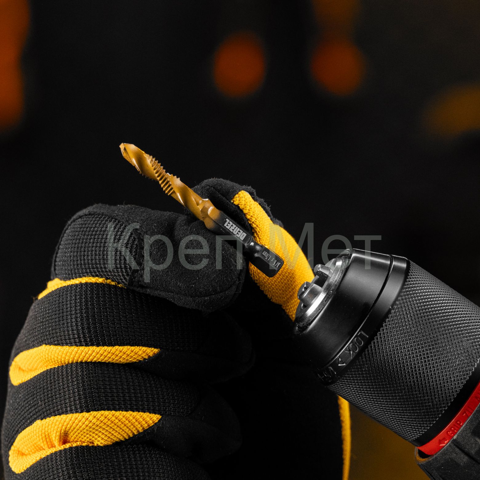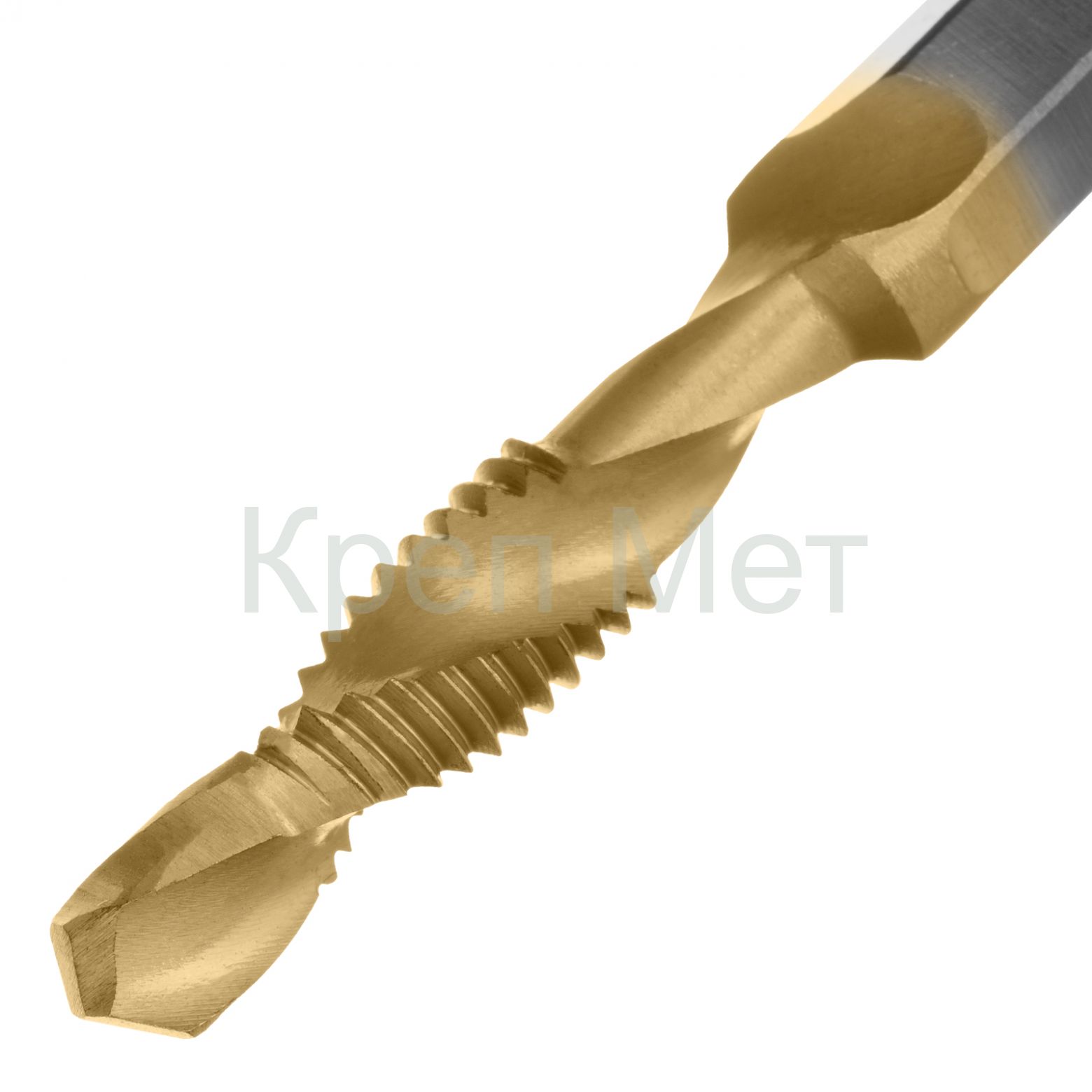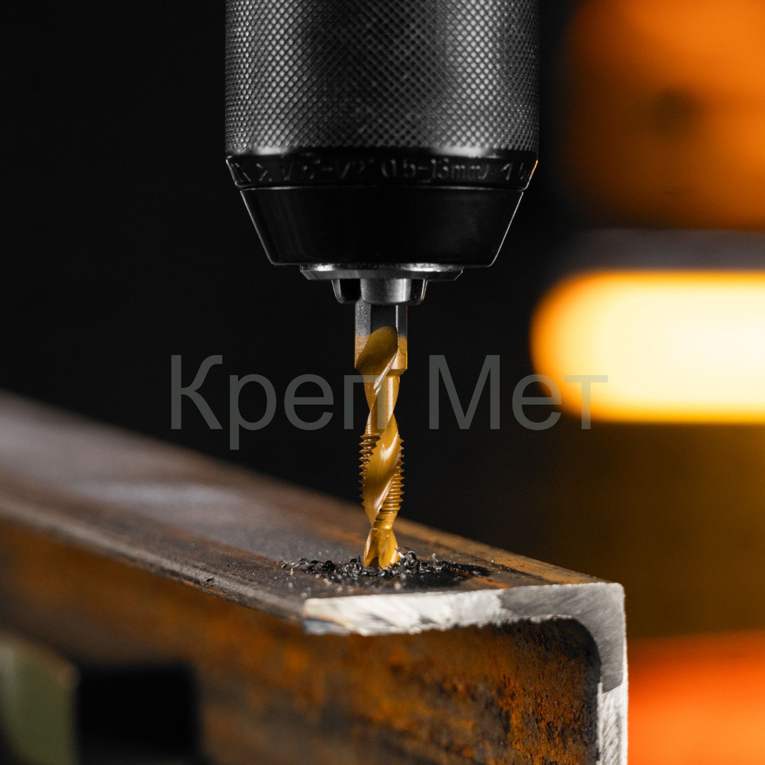 - Долговечность — нитридтитановое покрытие защищает от повреждений и уменьшает трение, что увеличивает устойчивость сверла-метчика к износу.