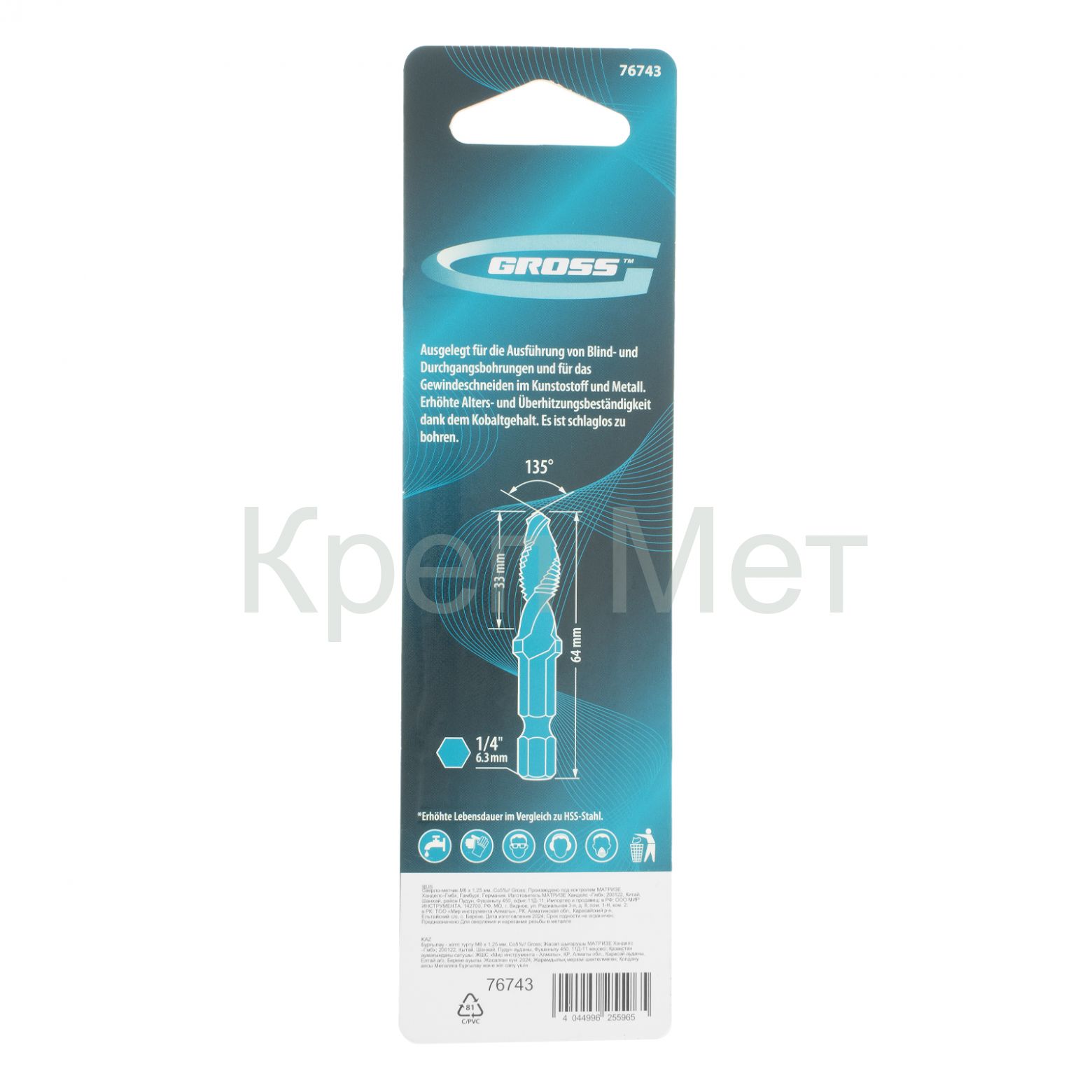 Сверло-метчик Gross 76743 из стали с 5%-м содержанием кобальта предназначено для получения глухих и сквозных отверстий в металлических заготовках с одновременным нарезанием правой резьбы M8 с шагом 1,25 мм. Позволяет существенно сэкономить время работы, объединив две операции в одну. Угол заточки 135° оптимален для работы с чугуном, сталью, алюминием, медью, бронзой.