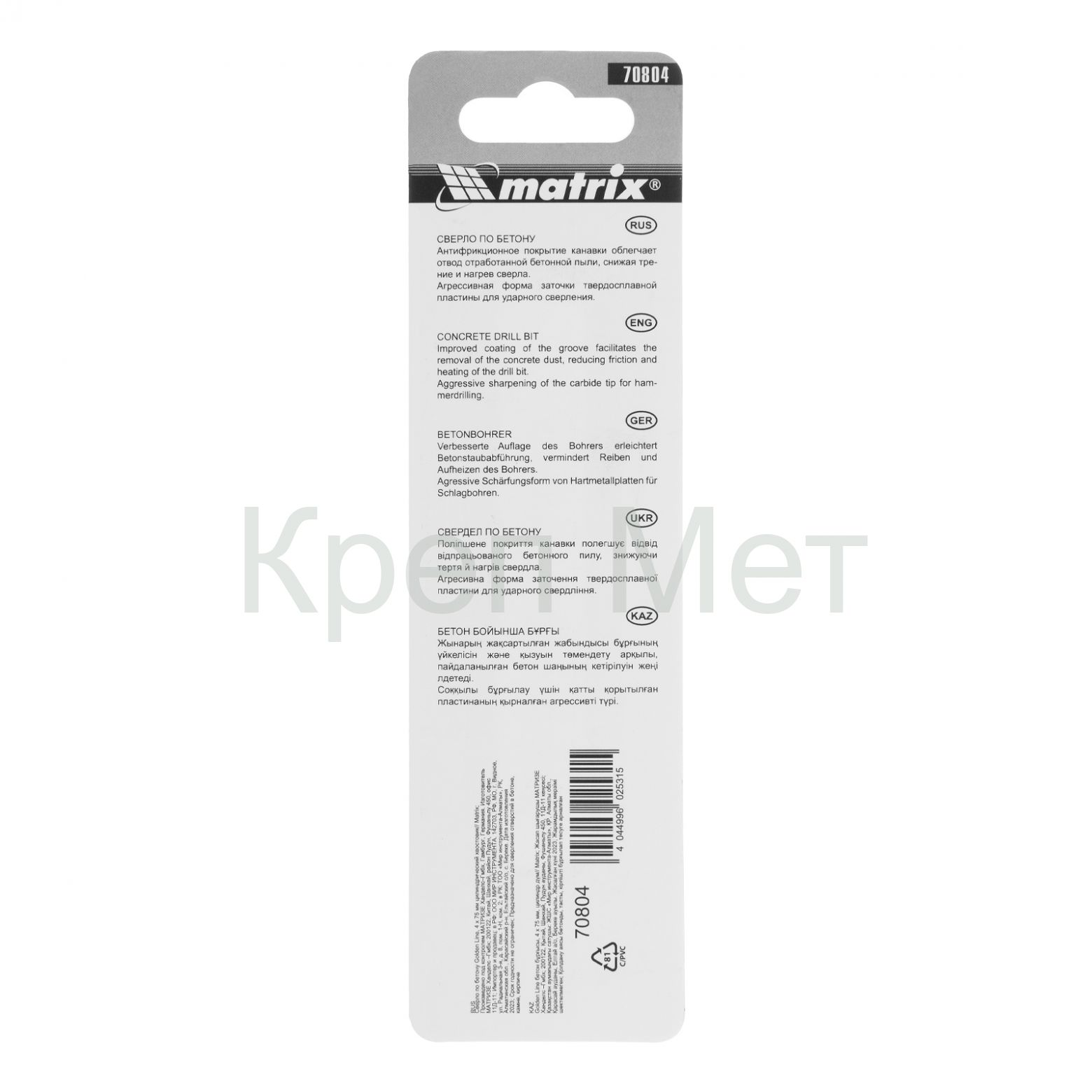 Сверло по бетону Matrix Golden Line 70804 размером 4 х 75 мм, с цилиндрическим хвостовиком, — сменная оснастка для дрели. Благодаря агрессивной форме заточки его можно использовать в режиме ударного сверления. Оснастка предназначена для работы с бетоном, кирпичом и другими твердыми материалами.