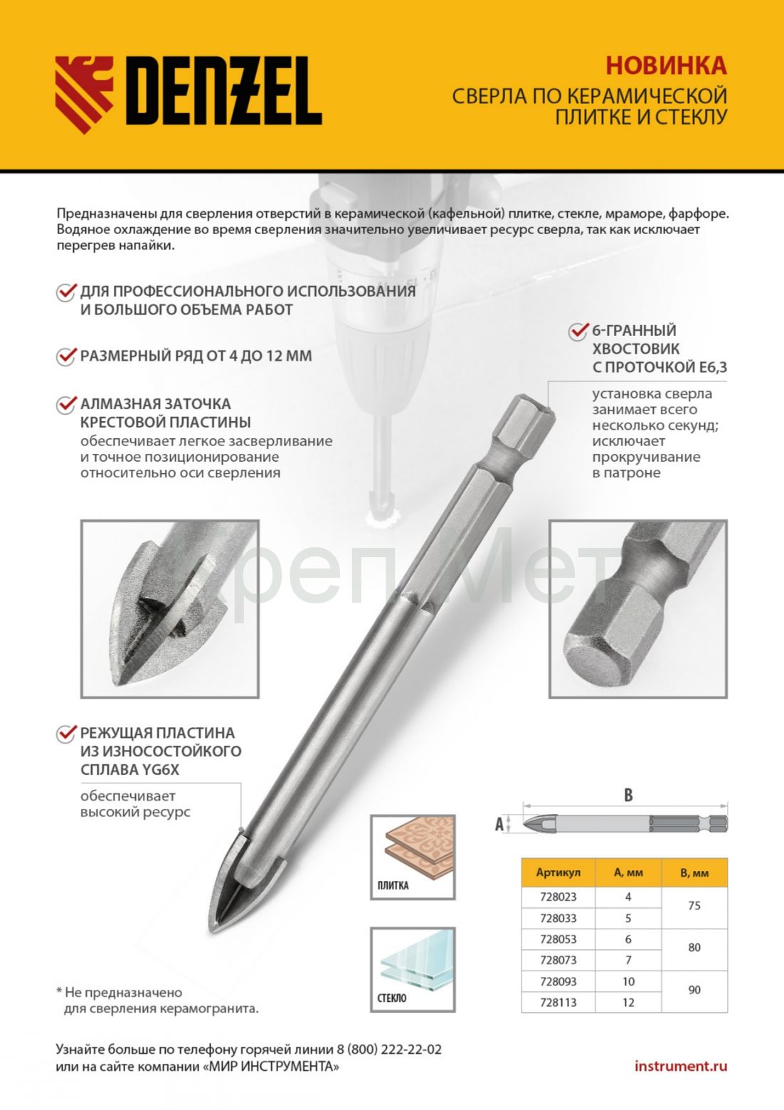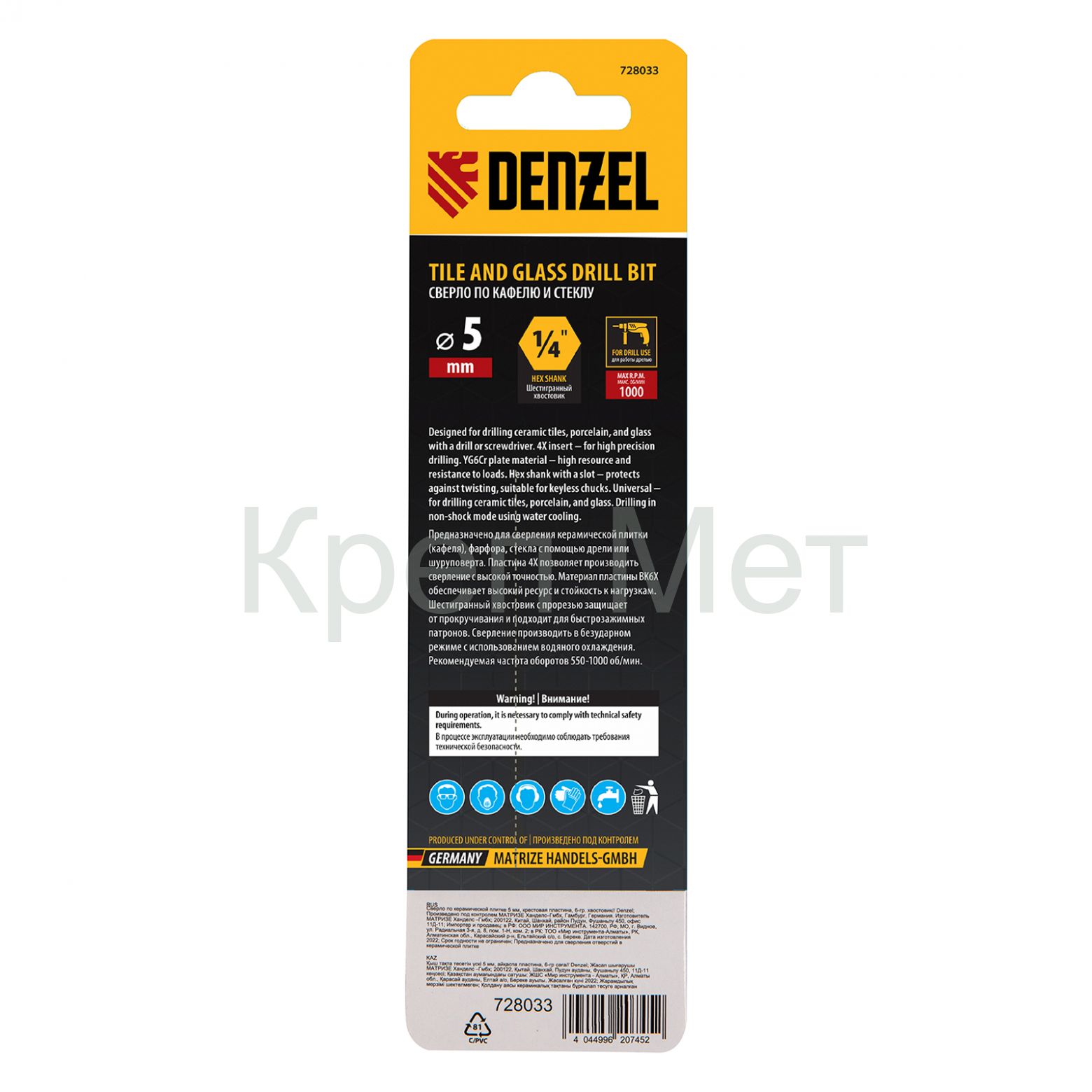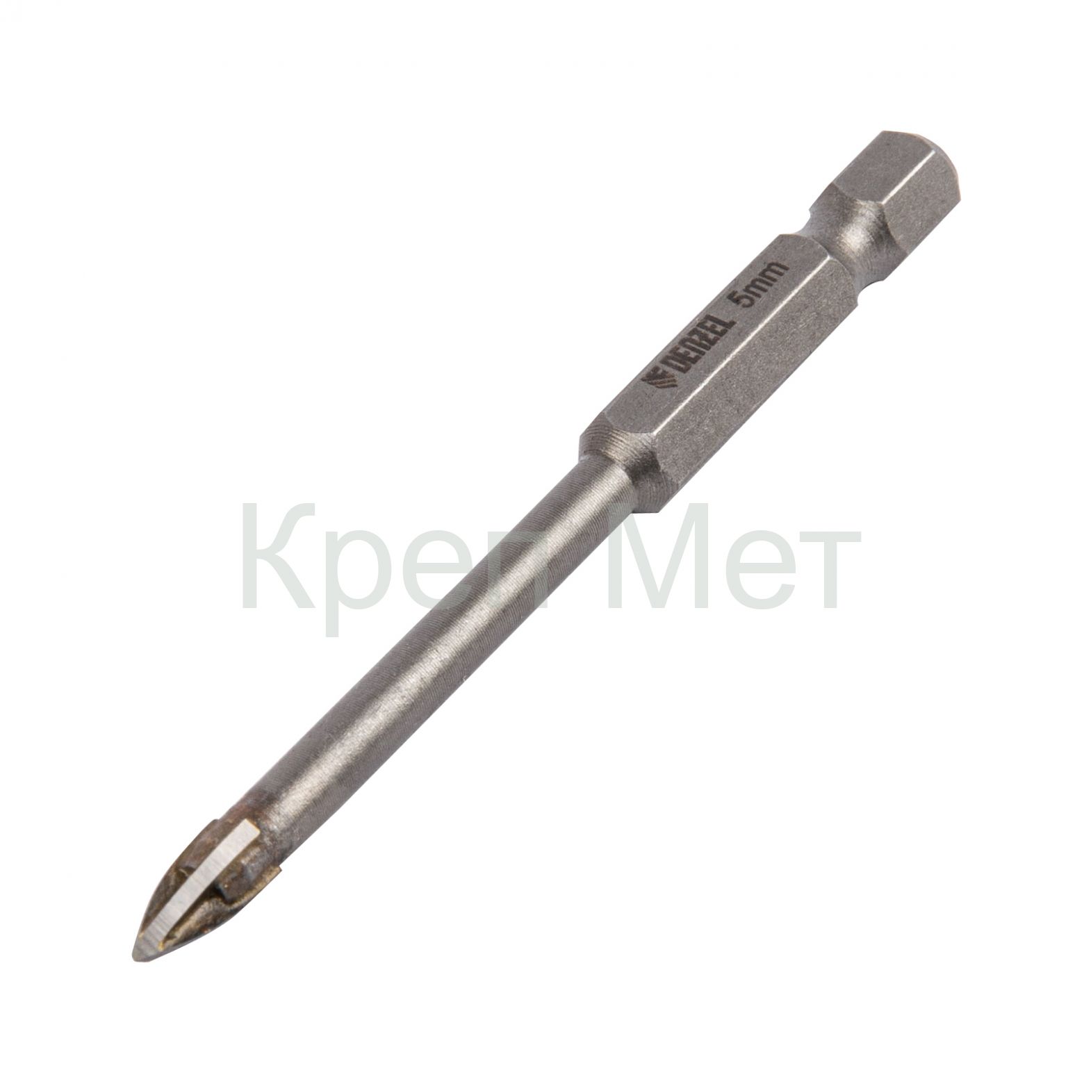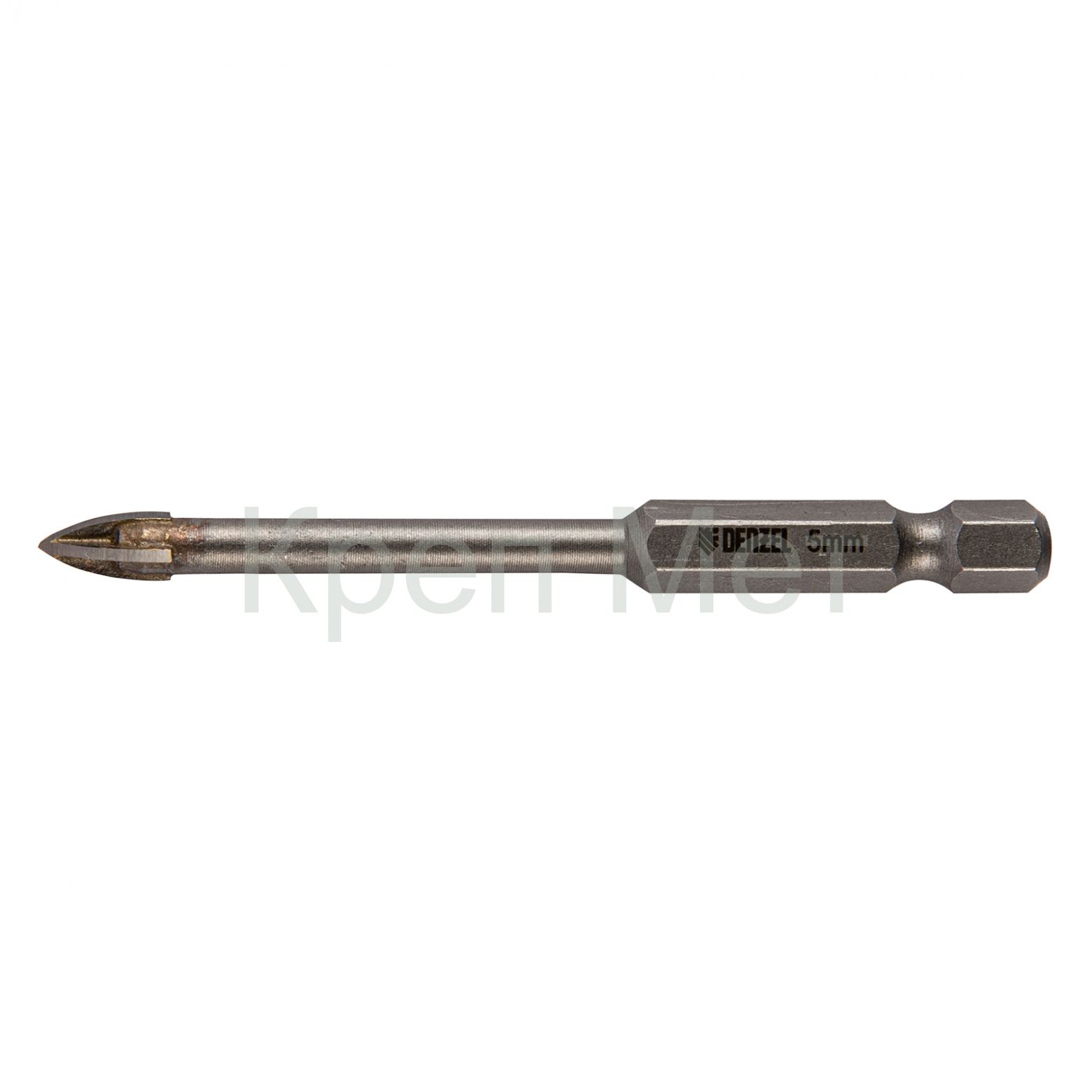 Сверло по керамической плитке 5 мм, крестовая пластина, шестигранный хвостовик// Denzel