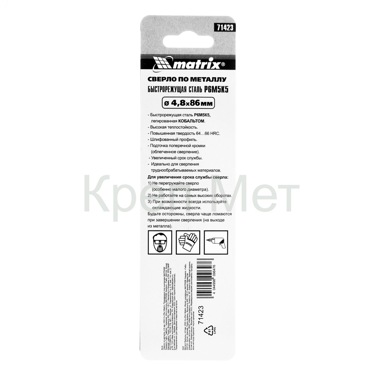 Сверло Matrix 71423 диаметром 4,8 мм, из стали HSS Co-5%, имеет угол заточки 135°, оптимальный для сверления легированных и цветных металлов. Подходит для профессионального использования на строительной площадке.