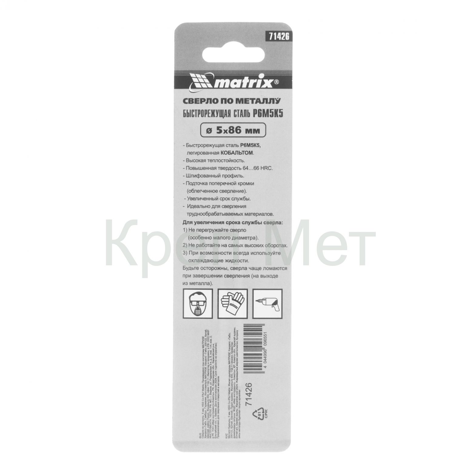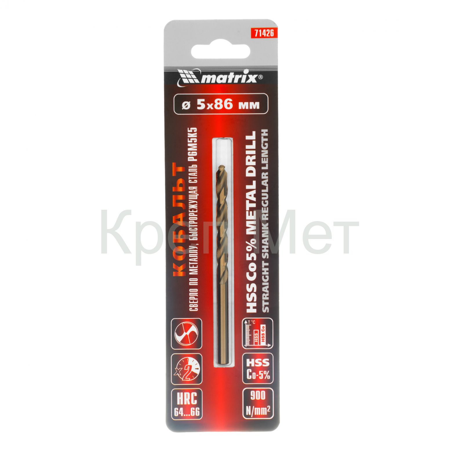 Сверло Matrix 71426 диаметром 5 мм, из стали HSS Co-5%, имеет угол заточки 135°, оптимальный для сверления легированных и цветных металлов. Подходит для профессионального использования на строительной площадке.