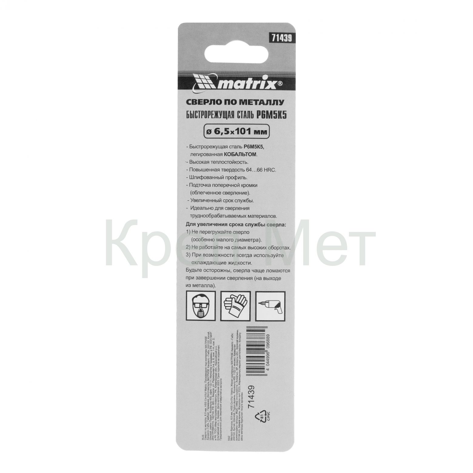 Сверло Matrix 71439 диаметром 6,5 мм, из стали HSS Co-5%, имеет угол заточки 135°, оптимальный для сверления легированных и цветных металлов. Подходит для профессионального использования на строительной площадке.