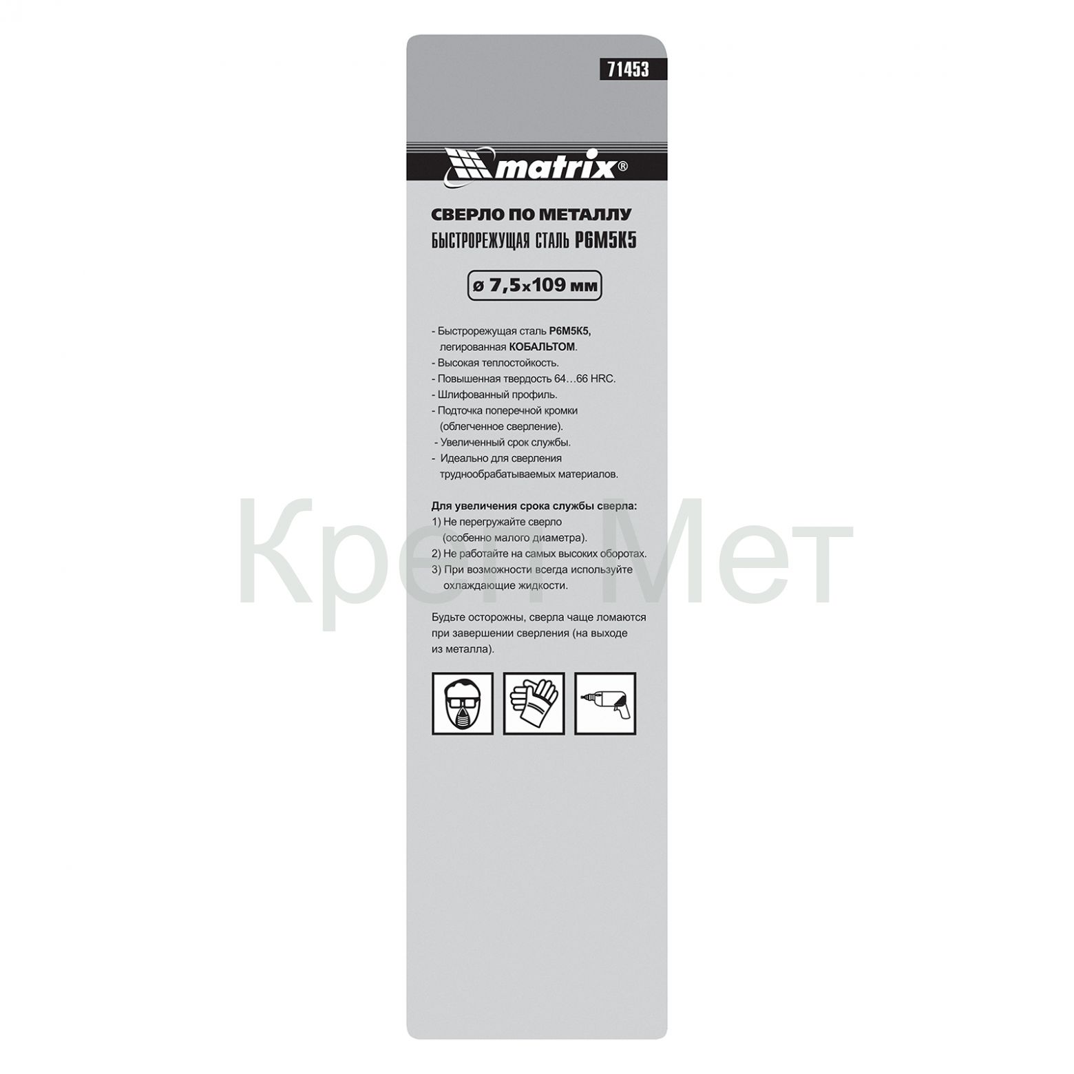 Сверло Matrix 71453 диаметром 7,5 мм, из стали HSS Co-5%, имеет угол заточки 135°, оптимальный для сверления легированных и цветных металлов. Подходит для профессионального использования на строительной площадке.