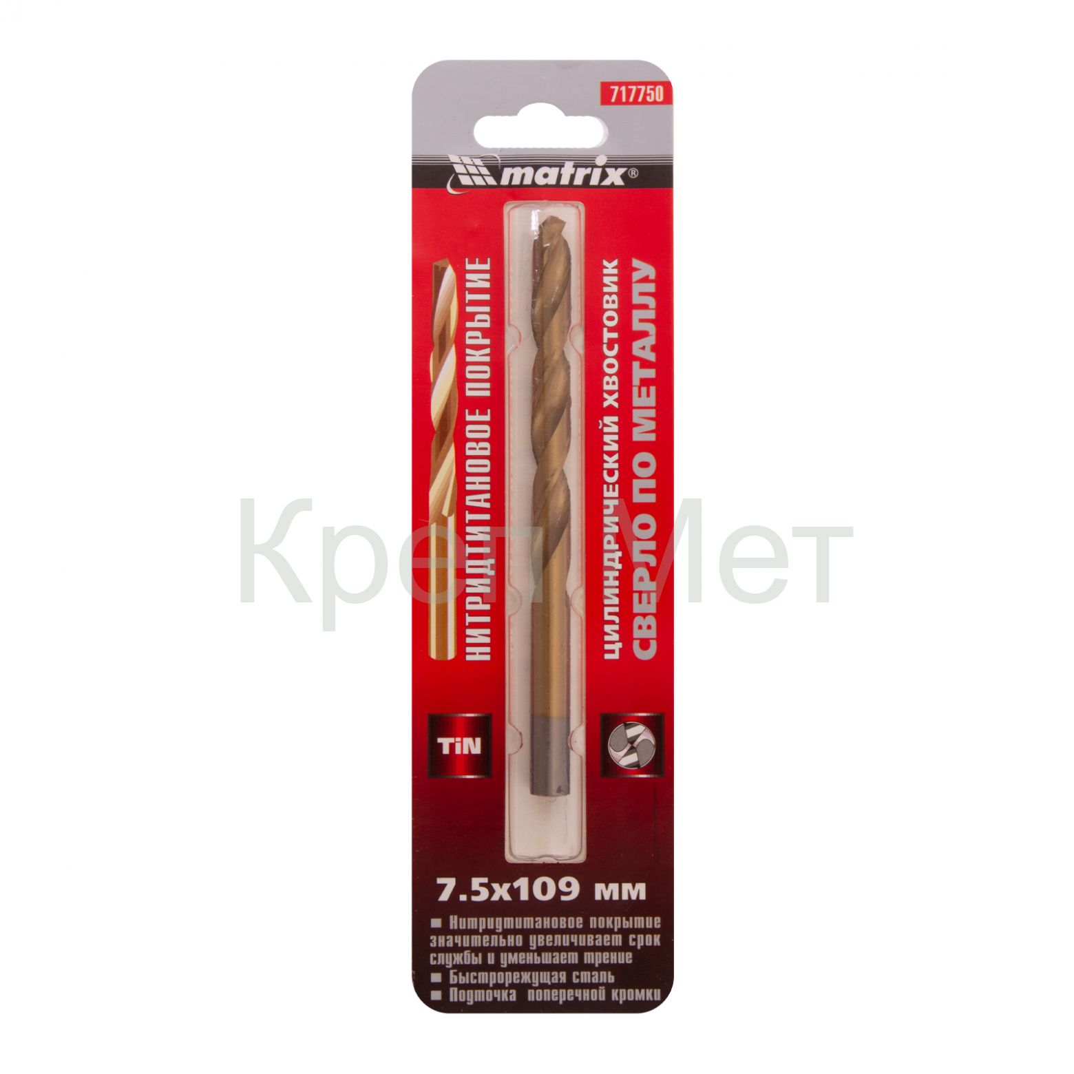 - Сверло по металлу, 7.5 мм, HSS, нитридтитановое покрытие, цилиндрический хвостовик Matrix