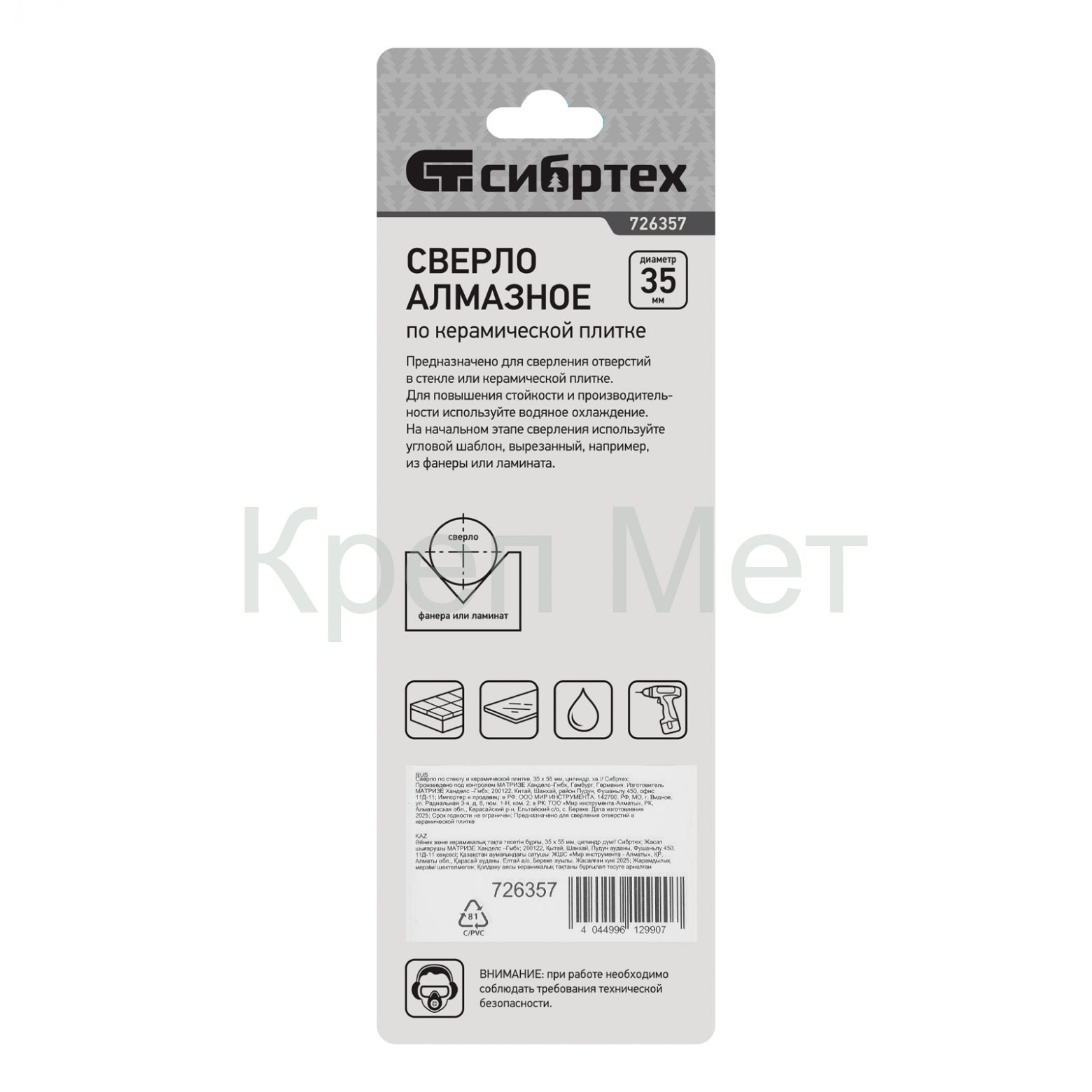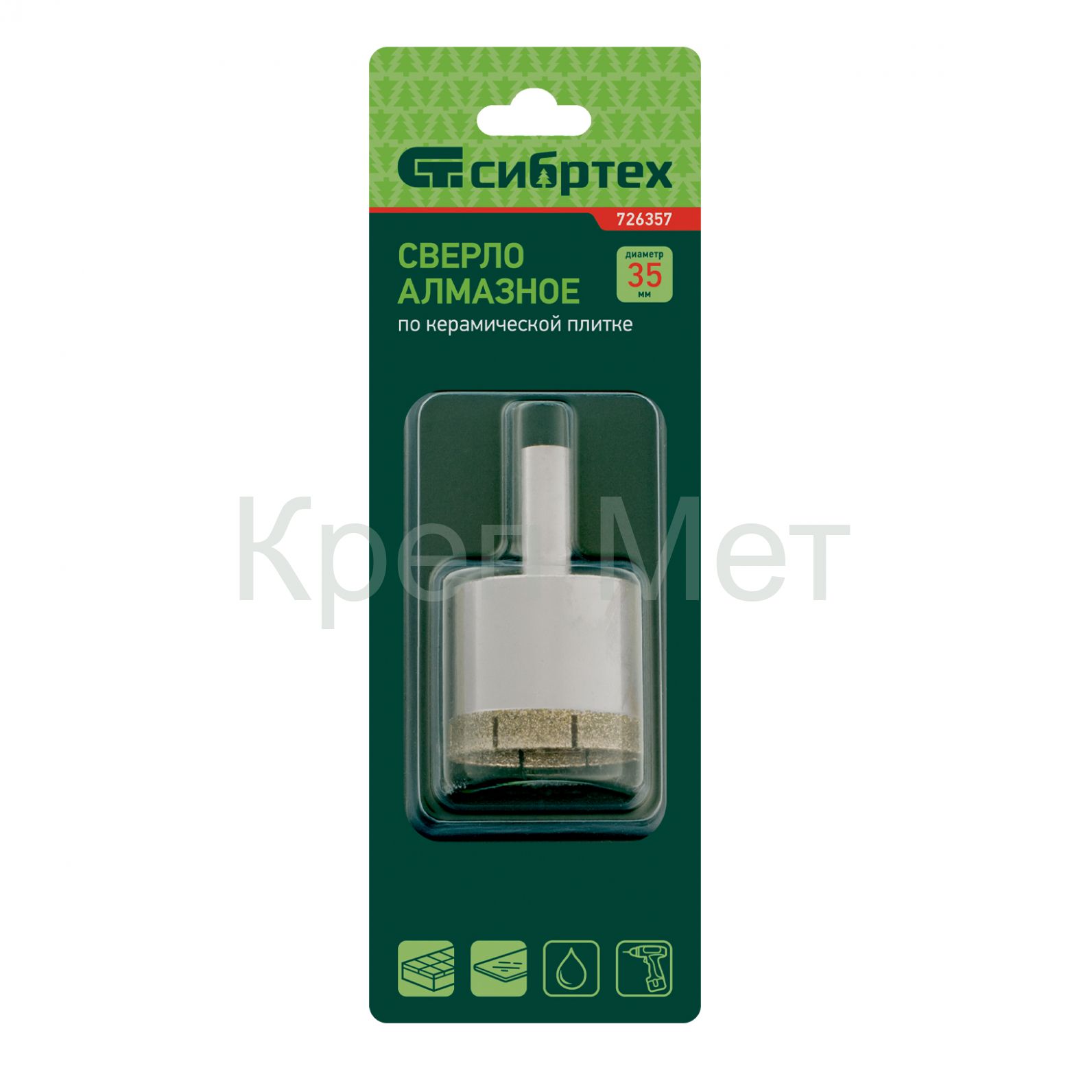 Сверло Сибртех 726357 размером 35 х 55 мм, с цилиндрическим хвостовиком, используется для получения ровных отверстий без сколов в стекле и керамической плитке. Устанавливается в патрон дрели или шуруповерта, работающих в диапазоне 350-700 об/мин. Во время работы рекомендуется применять водяное охлаждение — это существенно увеличит ресурс оснастки. Использование кондуктора (арт. 72830) позволяет точно позиционировать сверло и облегчает засверливание. Оснастка подходит для выполнения работ небольшого объема и рекомендована для использования в быту.