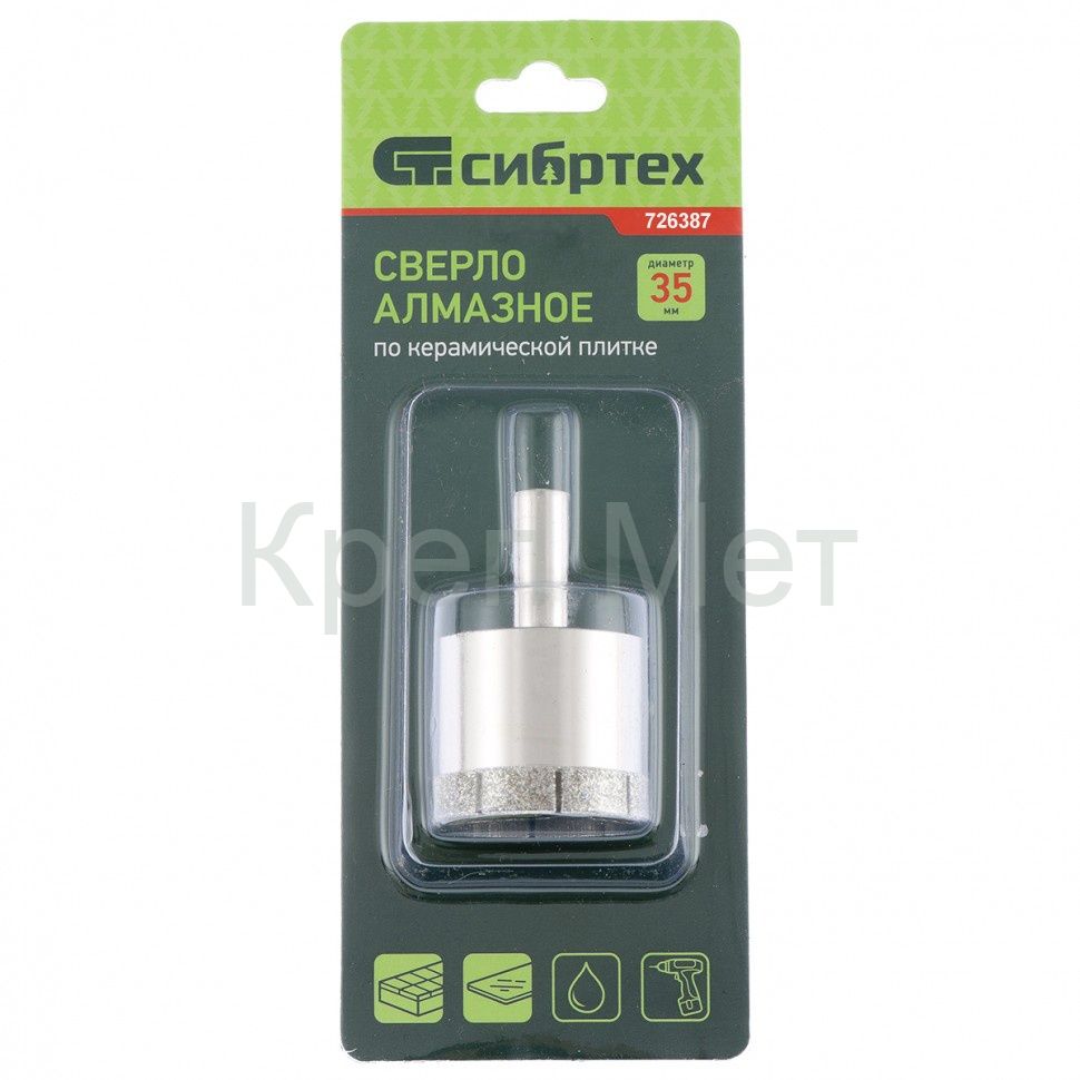 Сверло Сибртех 726387 размером 38 х 55 мм, с цилиндрическим хвостовиком, используется для получения ровных отверстий без сколов в стекле и керамической плитке. Устанавливается в патрон дрели или шуруповерта, работающих в диапазоне 350-700 об/мин. Во время работы рекомендуется применять водяное охлаждение — это существенно увеличит ресурс оснастки. Использование кондуктора (арт. 72830) позволяет точно позиционировать сверло и облегчает засверливание. Оснастка подходит для выполнения работ небольшого объема и рекомендована для использования в быту.