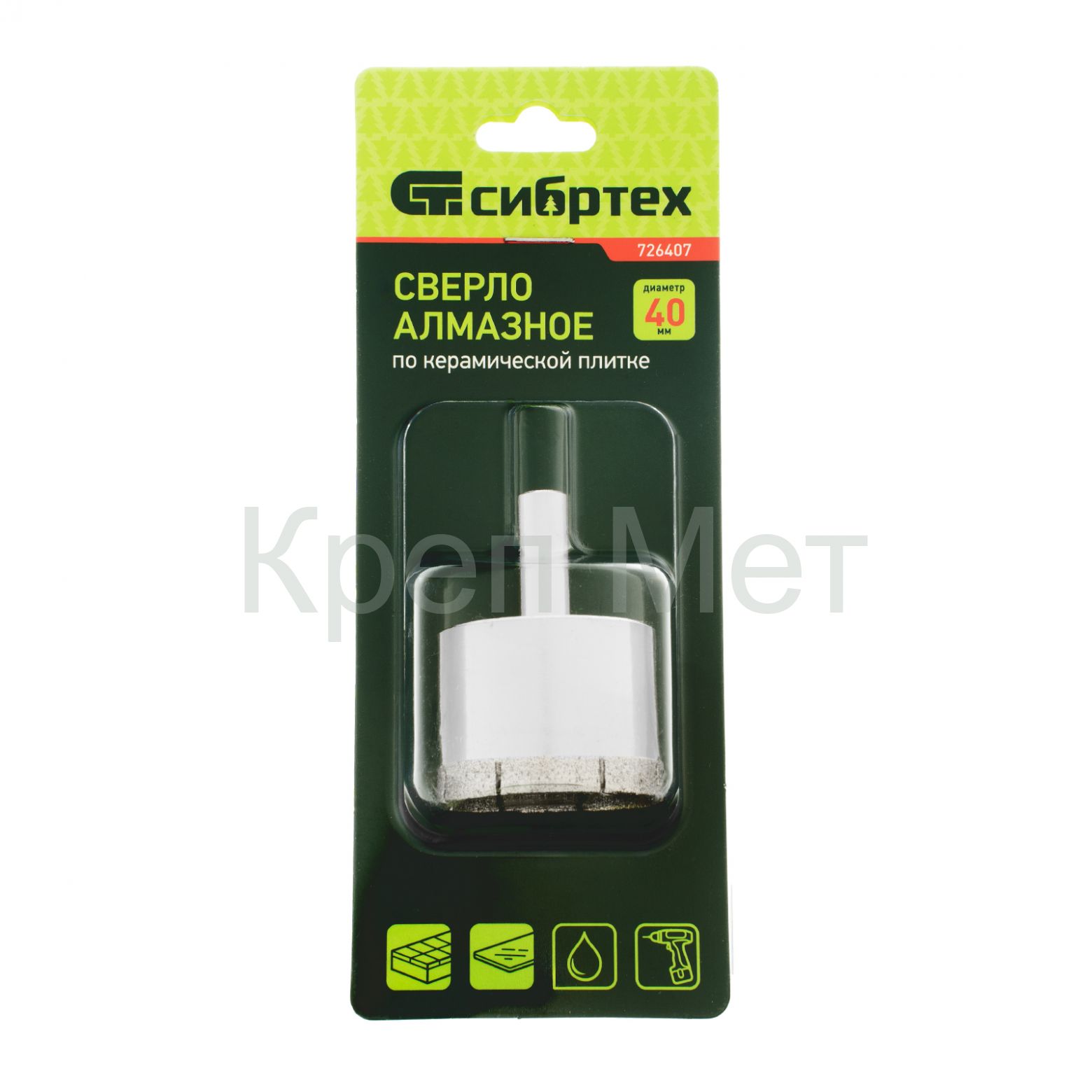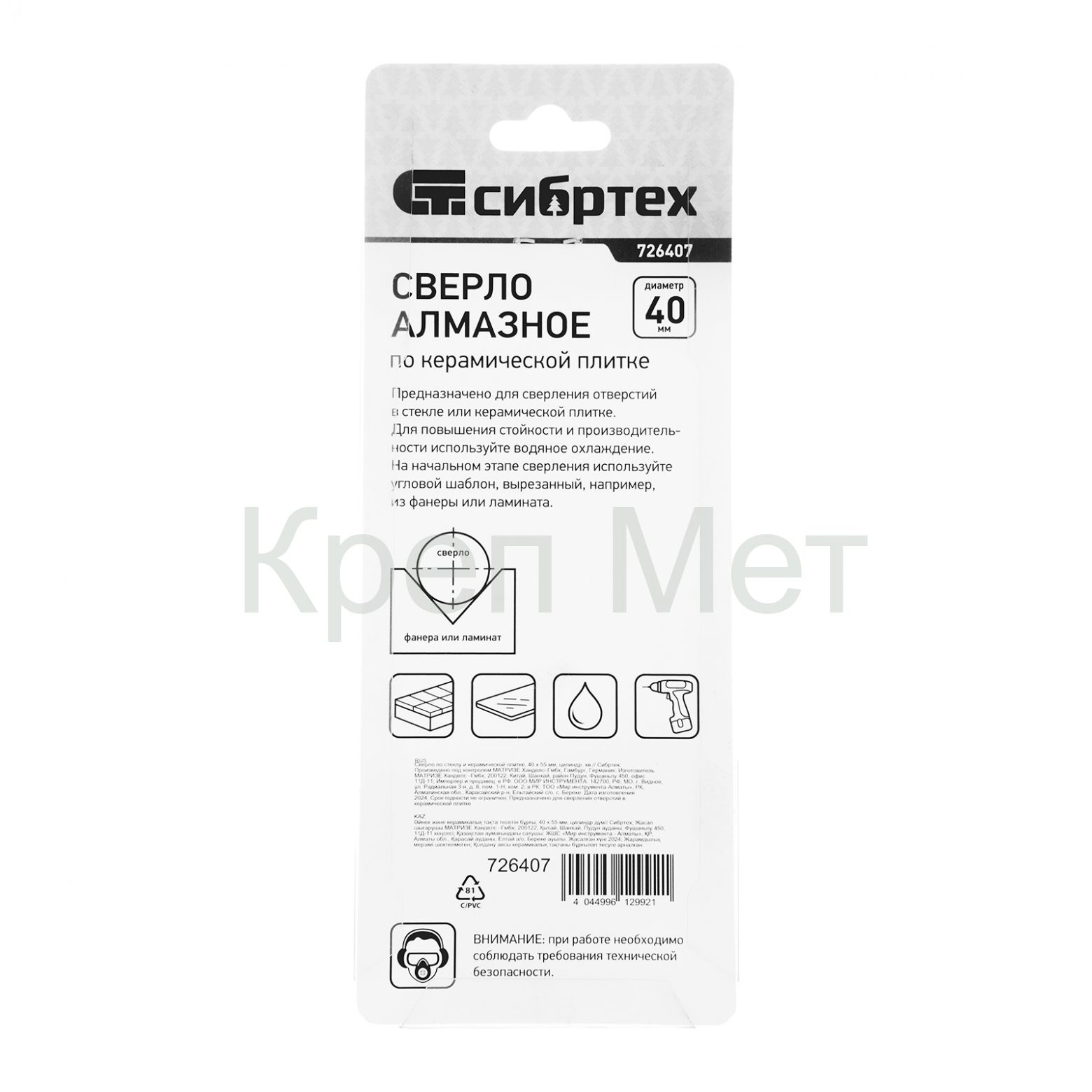 Сверло Сибртех 726407 размером 40 х 55 мм, с цилиндрическим хвостовиком, используется для получения ровных отверстий без сколов в стекле и керамической плитке. Устанавливается в патрон дрели или шуруповерта, работающих в диапазоне 350-700 об/мин. Во время работы рекомендуется применять водяное охлаждение — это существенно увеличит ресурс оснастки. Использование кондуктора (арт. 72830) позволяет точно позиционировать сверло и облегчает засверливание. Оснастка подходит для выполнения работ небольшого объема и рекомендована для использования в быту.