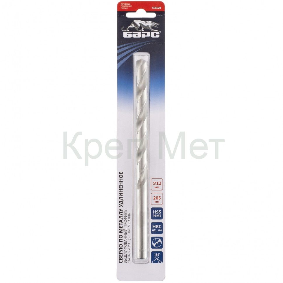 - Сверло спиральное по металлу, 12 x 205 мм, Р6М5, удлиненное Барс