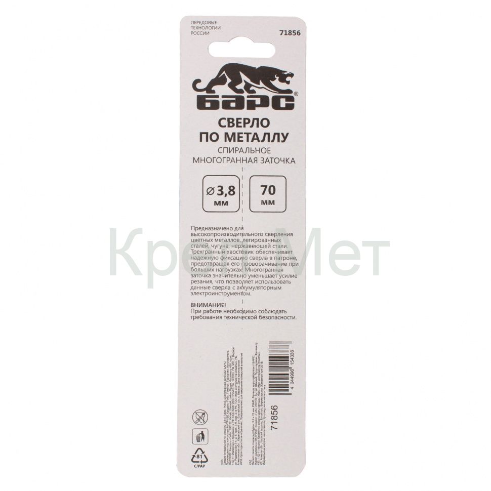 Спиральное сверло по металлу Барс 71856 из стали P9M3, диаметром 3,8 мм и длиной 70 мм, с многогранной заточкой, предназначено для получения отверстий в легированных сталях и цветных металлах. Многогранная заточка позволяет получать чистые и ровные отверстия с минимальным заусенцем, класс точности A обеспечивает высокое качество выполняемых работ. Сверло используется в производственных и бытовых целях.