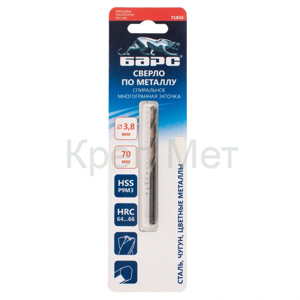 - Сверло спиральное по металлу, 3.8 x 70 мм, Р9М3, многогранная заточка Барс