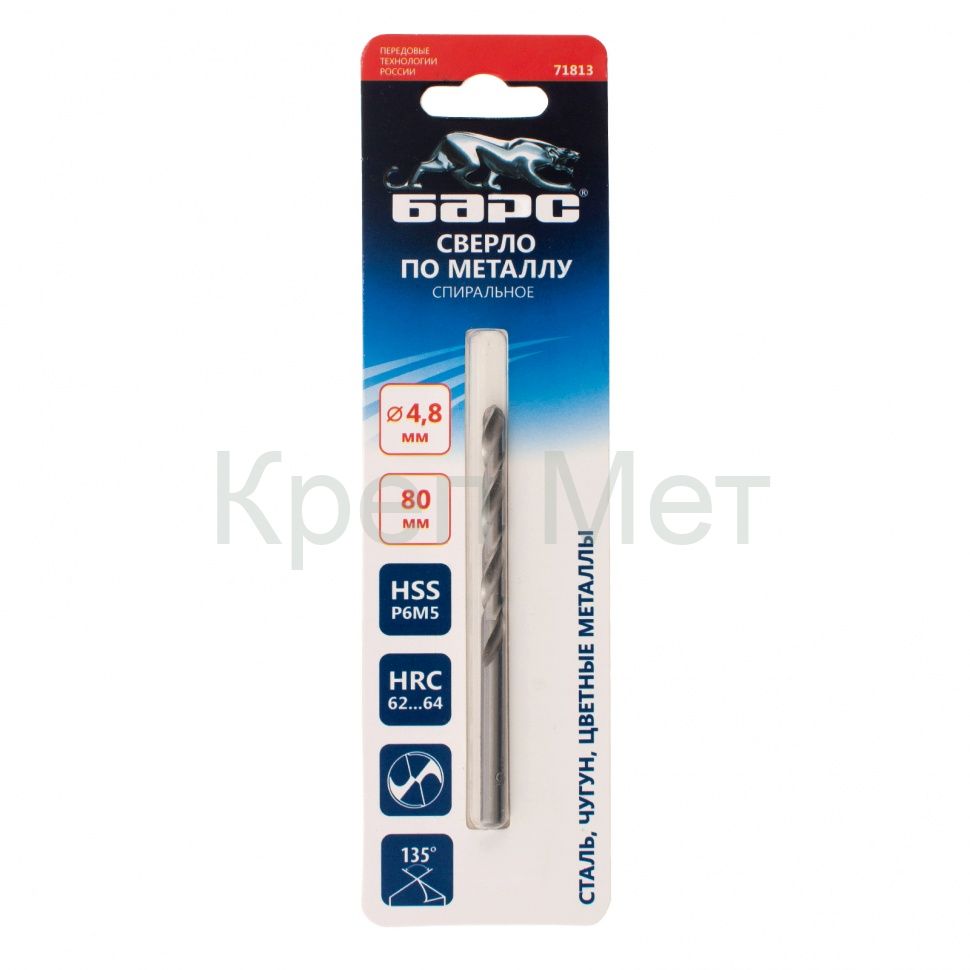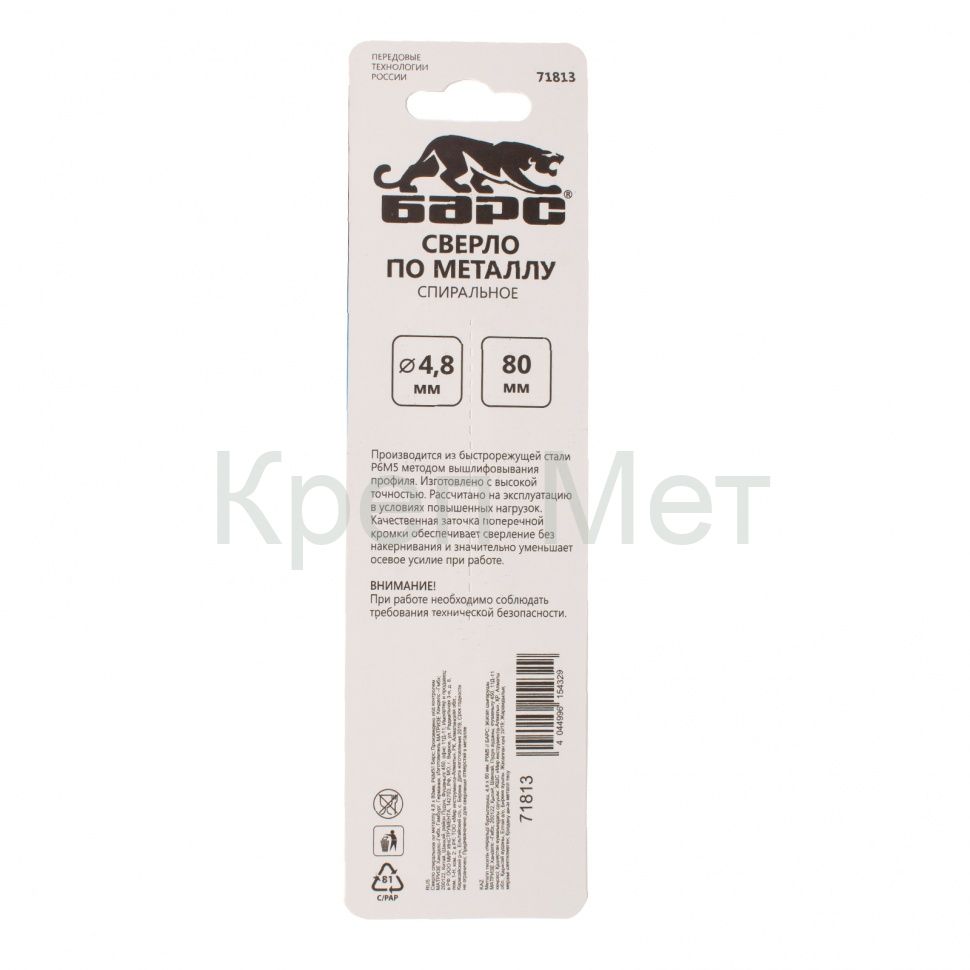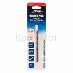 - Сверло спиральное по металлу, 4.8 x 80 мм, Р6М5 Барс