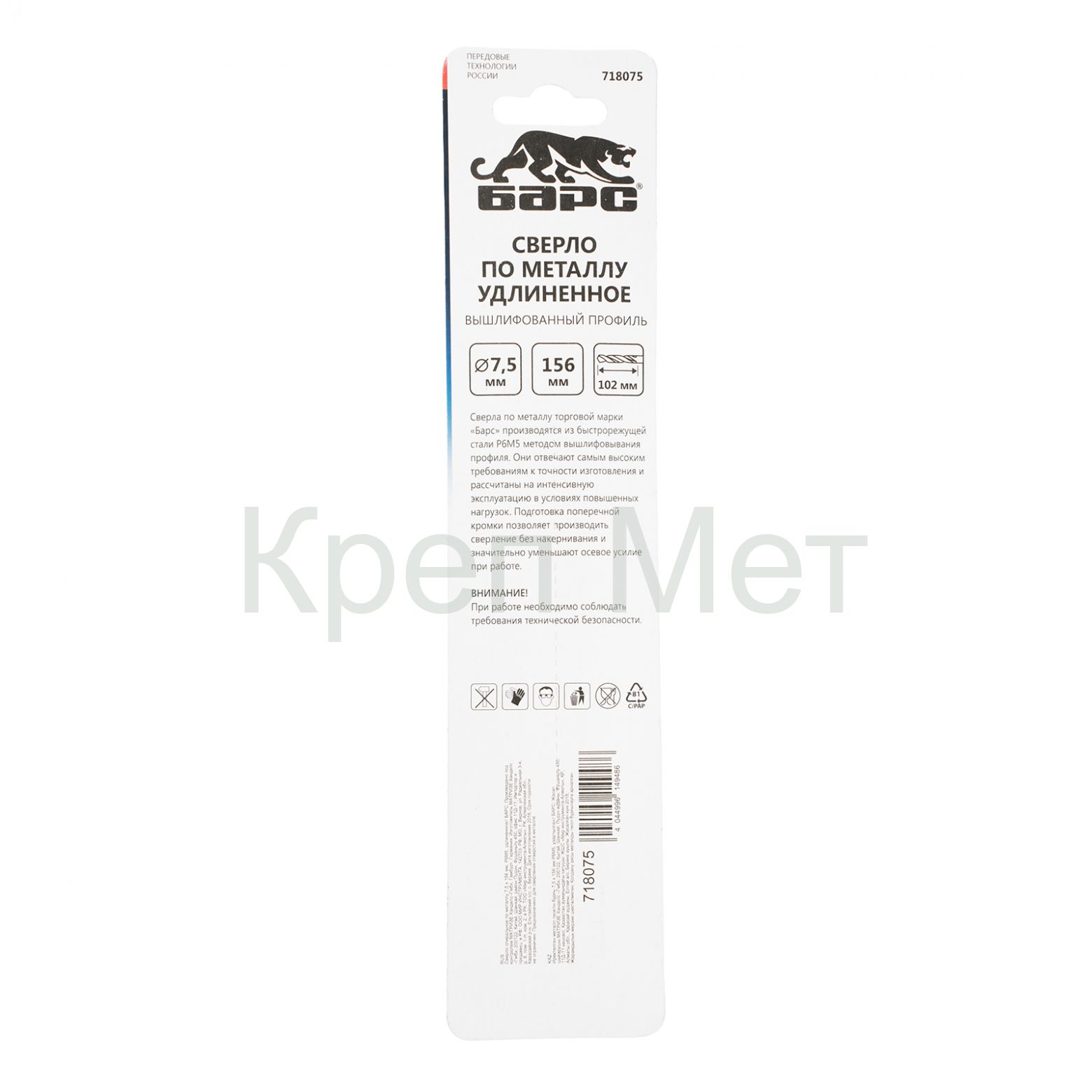 - Сверло спиральное по металлу, 7.5 х 156 мм, Р6М5, удлиненное Барс
