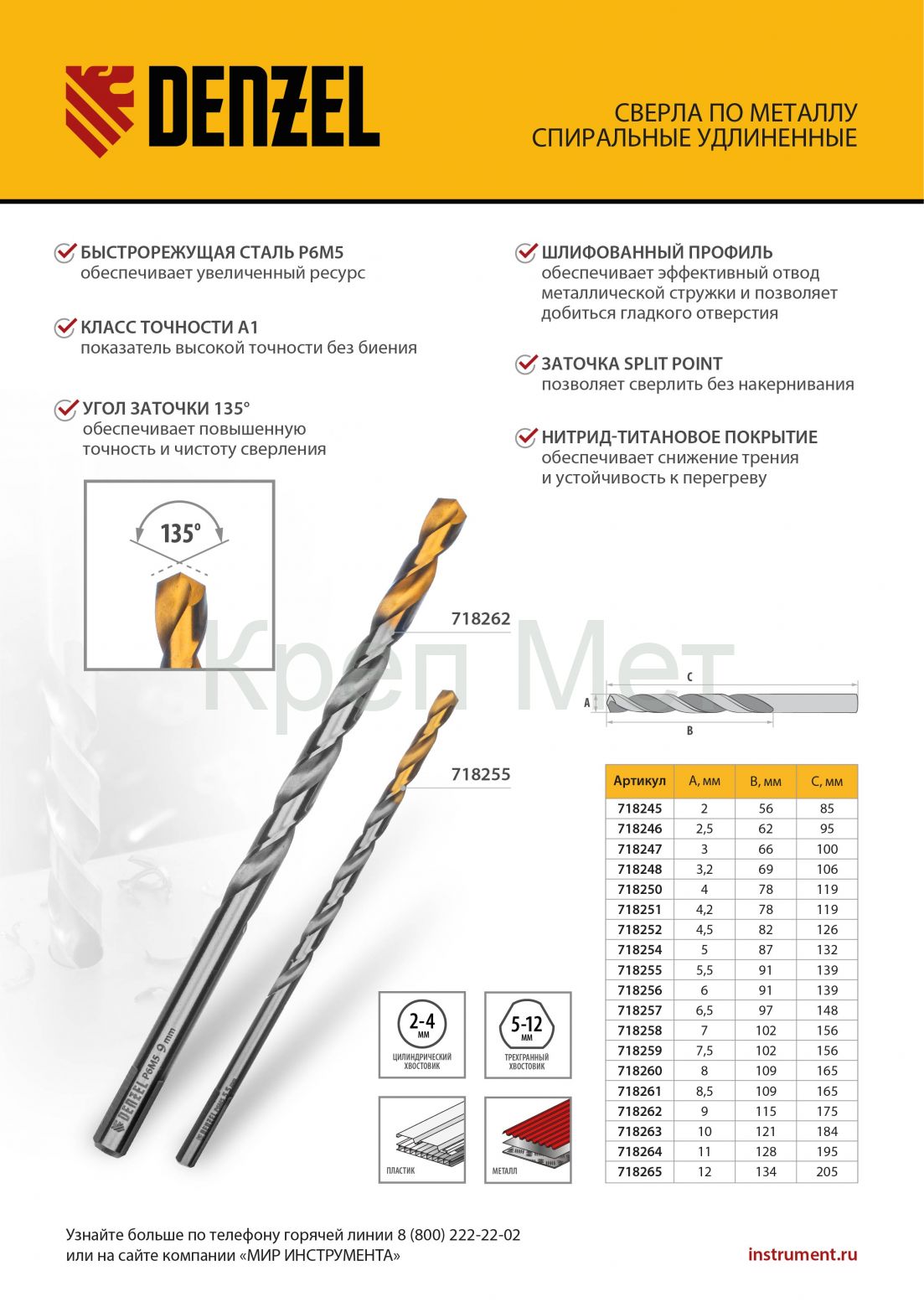 Удлиненное спиральное сверло по металлу Denzel Golden Tip 718262 из стали P6M5, размером 9 х 175 мм, предназначено для получения отверстий в легированных и цветных металлах — меди, алюминии, мягкой бронзе, титане, латуни. Оснастка позволяет эффективно справляться с этими задачами благодаря оптимальному углу заточки 135°. Класс точности A гарантирует высокое качество работ, а удлиненный профиль позволяет сверлить глубокие отверстия. Сверло используется для проведения монтажно-сборочных работ.
