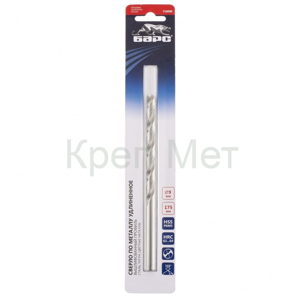 Сверло спиральное по металлу, 9 х 175 мм, Р6М5, удлиненное Барс