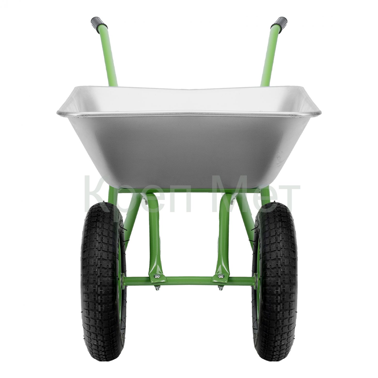 - Антикоррозийная защита — стальное корыто оцинковано, а рама, опора и колесные диски покрыты порошковой эмалью.