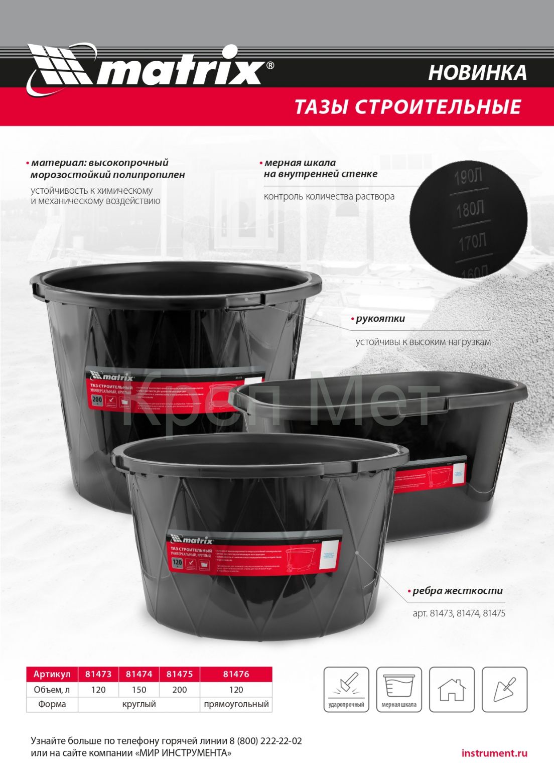 - Таз строительный круглый универсальный, 150л, ударопрочный, с ребрами жесткости Matrix