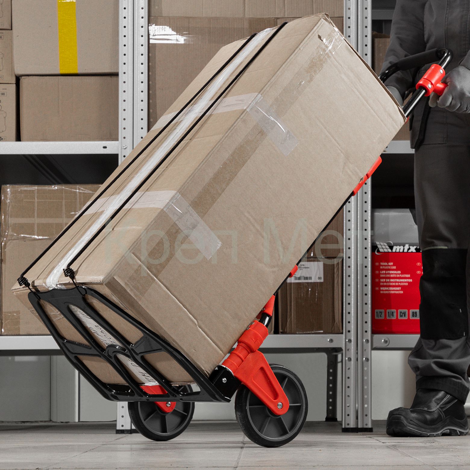 • Удобное хранение и транспортировка — платформа и колеса складываются, поэтому тележка не занимает много места.