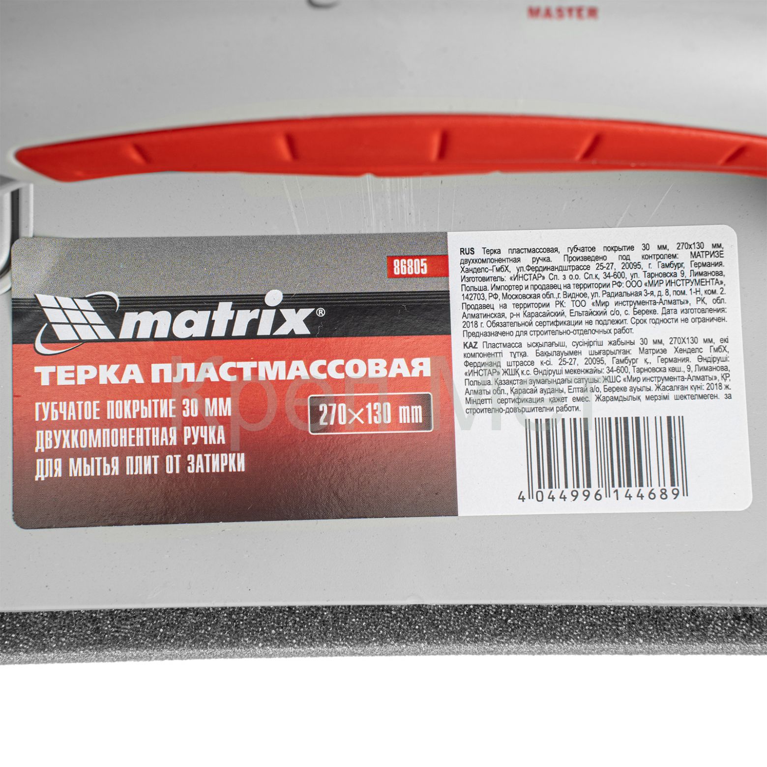- Терка пластмассовая, губчатое покрытие 30 мм, 270 x 130 мм, двухкомпонентная ручка Matrix