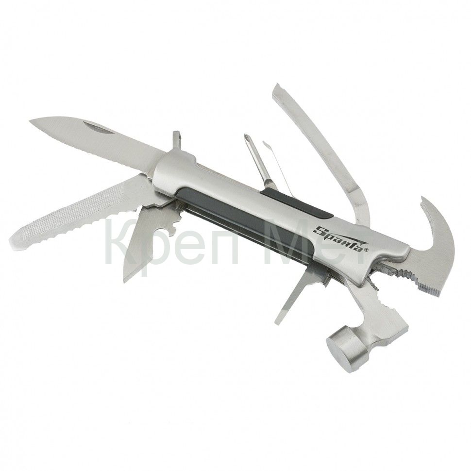 Трансформер Sparta 176075 выполняет 12 функций и включает в себя предметы, необходимые дома, на даче, рыбалке или охоте, а также в походе или поездке. Ножом можно разрезать веревку или вскрыть упаковку, а консервным ножом-открывалкой — открыть банку или бутылку. Молоток-гвоздодер пригодится для забивания и выпрямления гвоздей, а отвертки — для работы с резьбовым крепежом.