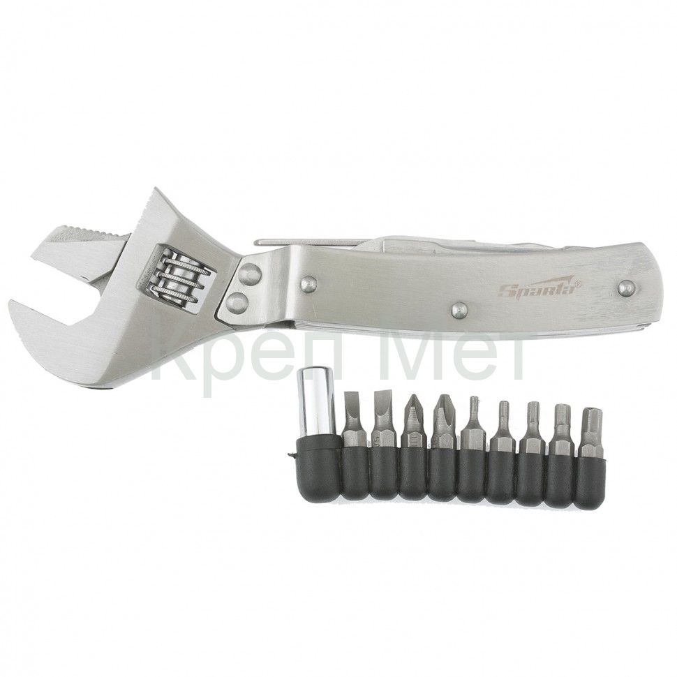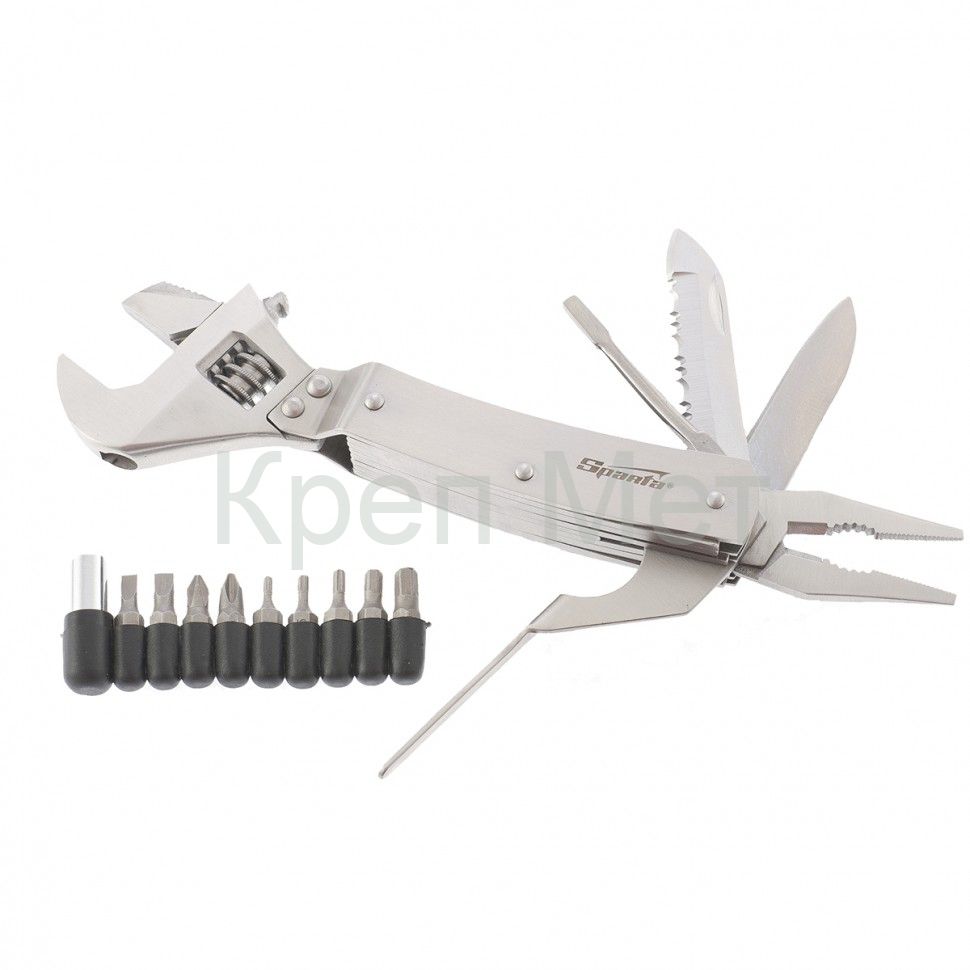 Трансформер Sparta 176065 длиной 170 мм включает в себя 8 предметов и позволяет успешно решать самые разные задачи. Ножом можно разрезать веревку или картон, напильником — заточить рыболовный крючок. Многофункциональный набор включает также разводной ключ, пассатижи и биты, необходимые для выполнения слесарных работ. Его можно использовать дома, на даче, в гараже, а также в походе, на охоте или рыбалке.
