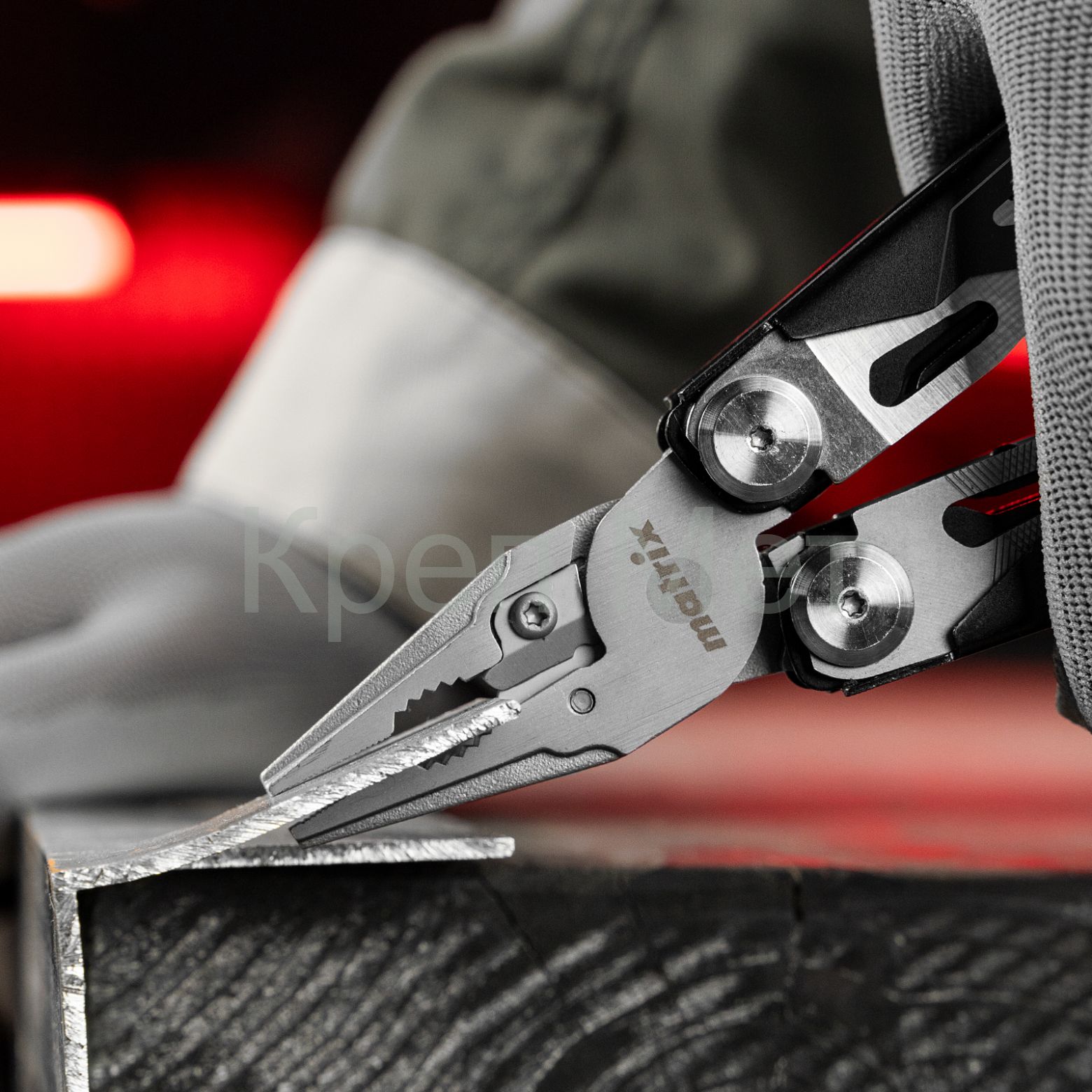 Трансформер (мультитул) Matrix 17627 длиной 160 мм, с авторазжимом, способен выполнять 15 функций. Подходит для выполнения несложных слесарно-монтажных работ, будет полезен дома, на даче, в походе, на рыбалке, также пригодится автолюбителям. Корпус изготовлен из прочной нержавеющей стали, поэтому инструмент прослужит долго.