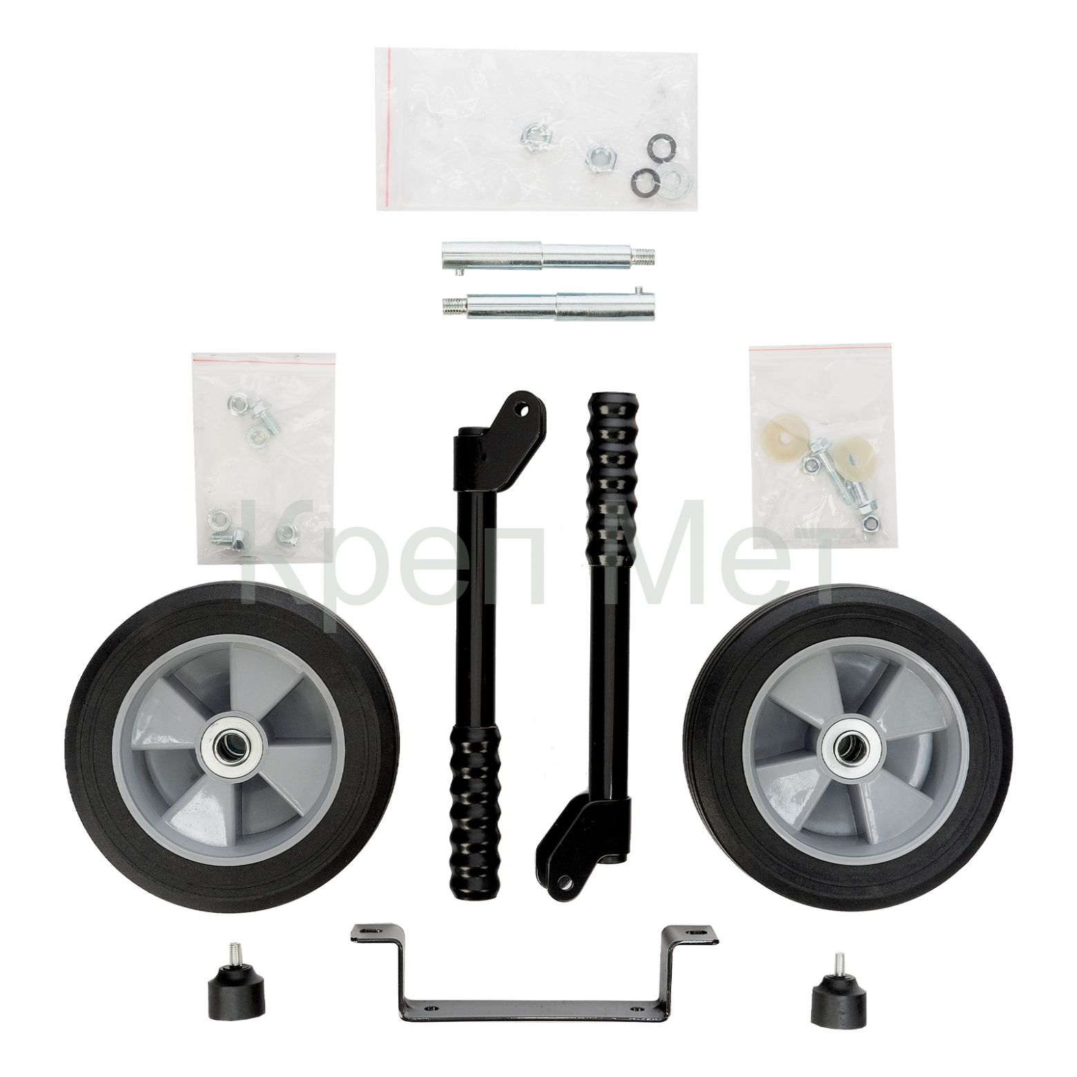 Колесо - 2 штКронштейн опоры - 1 штОпора - 2 штОсь - 2 штРучка - 2 штБолт М8×50 - 2 штБолт М8×16 - 2 штГайка М8 фланцевая - 4 штГайка М8 самоконтрящаяся - 2 штГайка М12 - 2 штШайба М12 пружинная - 2 штШайба М12 - 2 штШайба пластиковая - 4 шт