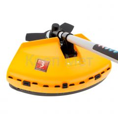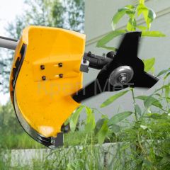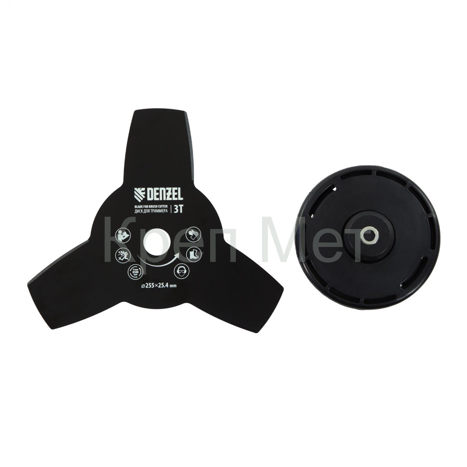 - Дополнительные возможности — можно приобрести диск Denzel 96323 с шириной скашивания 230 мм для быстрого удаления растительности с жесткими стеблями, 96328 для скашивания молодых побегов кустарника диаметром до 3 мм, 96340 для срезания борщевика, кустарника и молодых побегов деревьев с диаметром стволов до 10 мм.