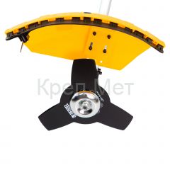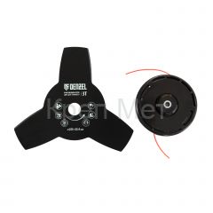 - Дополнительные возможности — можно приобрести диск Denzel 96323 с шириной скашивания 230 мм для быстрого удаления растительности с жесткими стеблями, 96328 для скашивания молодых побегов кустарника диаметром до 3 мм, 96340 для срезания борщевика, кустарника и молодых побегов деревьев с диаметром стволов до 10 мм.