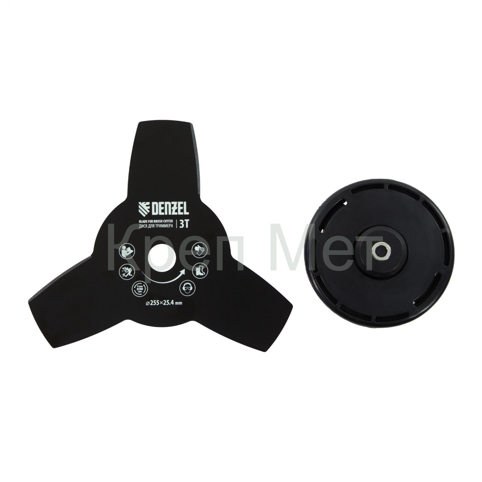- Дополнительные возможности — можно приобрести диск Denzel 96323 с шириной скашивания 230 мм для быстрого удаления растительности с жесткими стеблями, 96328 для скашивания молодых побегов кустарника диаметром до 3 мм, 96340 для срезания борщевика, кустарника и молодых побегов деревьев с диаметром стволов до 10 мм.