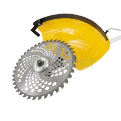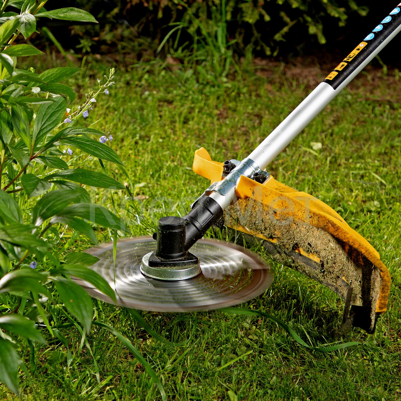 - Дополнительные возможности — можно приобрести и установить на триммер диски Denzel 96323, 96325 для быстрого удаления растительности с жесткими стеблями (полыни, крапивы, лебеды) или 96328 для скашивания молодых побегов кустарника диаметром до 3 мм.
