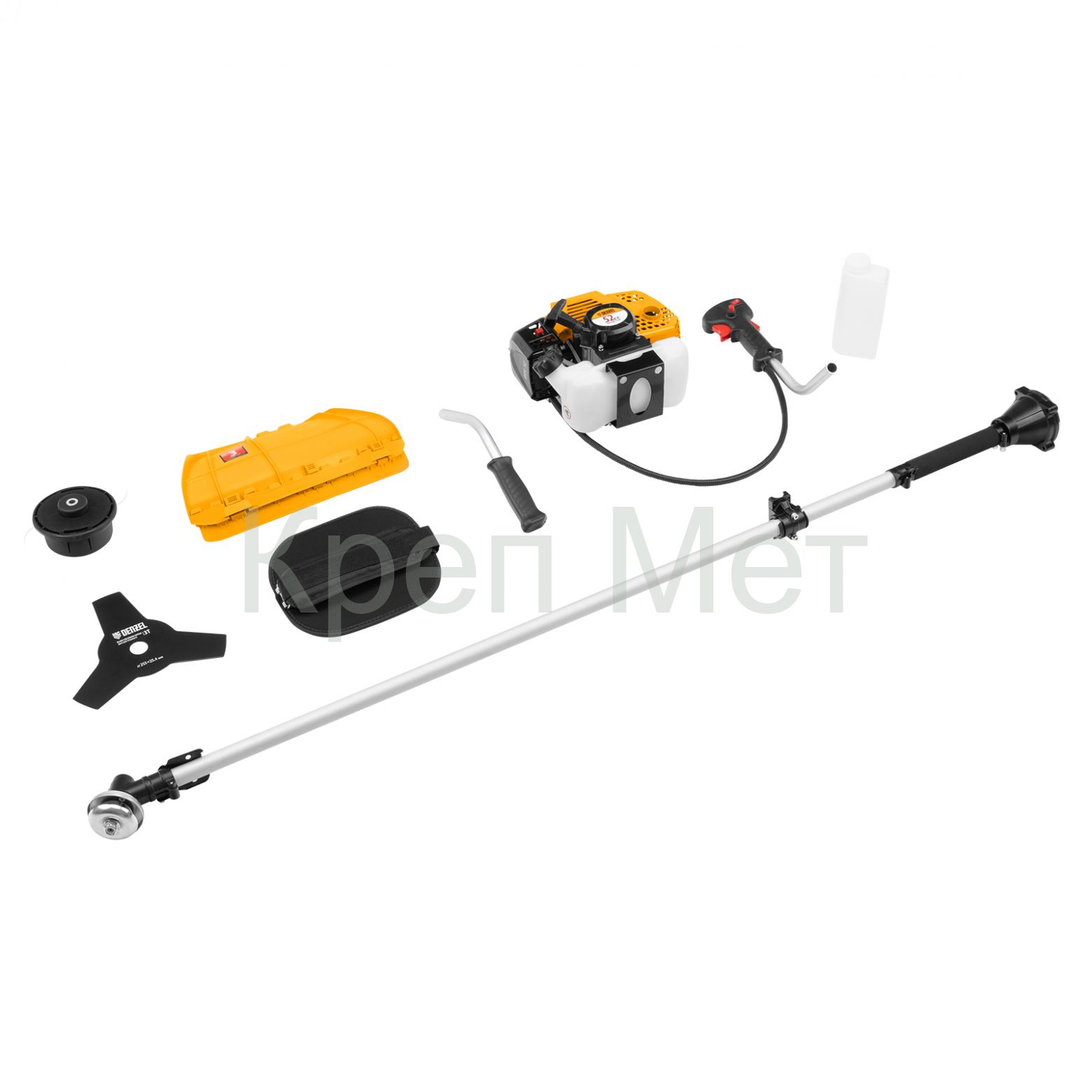 - Быстрая подготовка к работе — бензотриммер поставляется с уже установленным на штангу редуктором и корпусом сцепления.