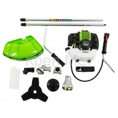 Бензиновый триммер Сибртех КС-2500Р 962545 с разъемной штангой, поставляющийся комплектом из 2 частей, имеет двигатель объемом 43 куб. см и мощностью 2,5 л. с., благодаря чему успешно справляется с подравниванием газона, скашиванием травы на лужайке и уничтожением сорняков. Выполнение этих задач облегчают режущие элементы — катушка с леской и трехлопастный нож. Леской триммер скашивает 42 см за один проход, а ножом — 25,5 см, поэтому можно за короткое время привести дачный участок в порядок. Благодаря разборной штанге мотокоса не занимает много места во время хранения и транспортировки.
