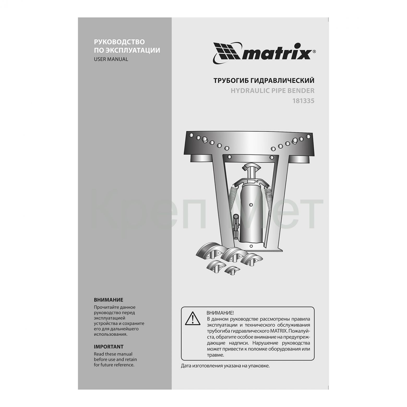 - Трубогиб гидравлический, 1/2-2", 12 т, в комплекте с башмаками Matrix