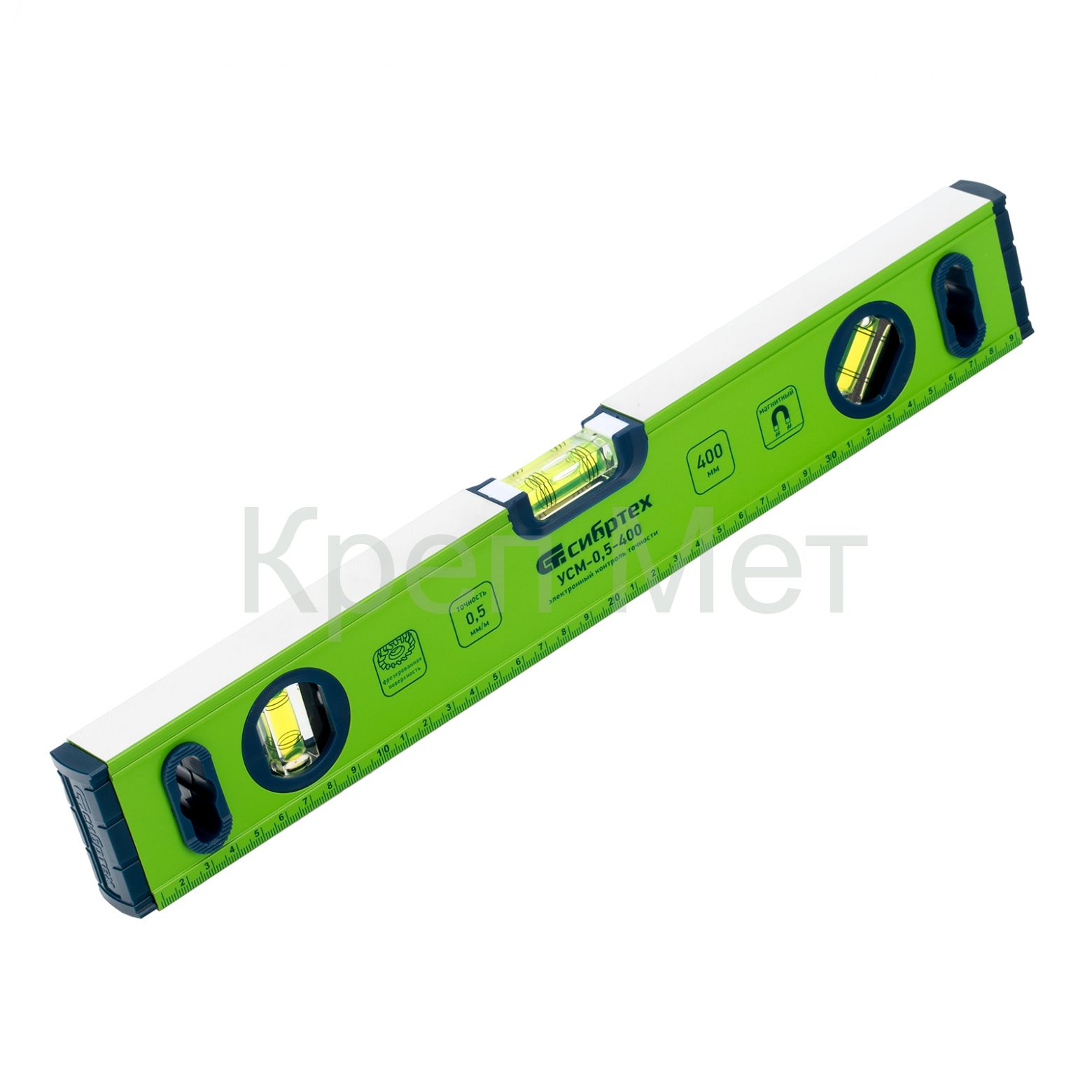 Алюминиевый фрезерованный уровень Сибртех УСМ-0,5-400 34113 длиной 400 мм, магнитный, с 3 глазками, поможет найти отклонения от горизонтальной и вертикальной плоскостей и угла 45 градусов. Инструмент незаменим при осуществлении строительных и ремонтных работ, т.к. обеспечивает высокую точность работы.,Для определения отклонения вертикали 90 градусов необходимо использовать пузырьковую ампулу только в верхнем положении уровня. Только базовая поверхность является рабочей (противоположная ампуле 180 градусов).