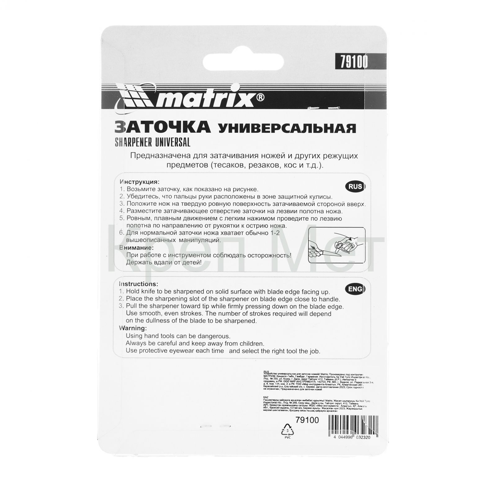 Универсальное устройство для заточки ножей Matrix 79100 позволяет 1-2 движениями восстановить рабочие качества режущих инструментов. Подходит как правшам, так и левшам. Для защиты пальцев предусмотрена специальная кулиса. Простота использования делает приспособление незаменимым помощником для домашних хозяек, садоводов, владельцев дачных участков.