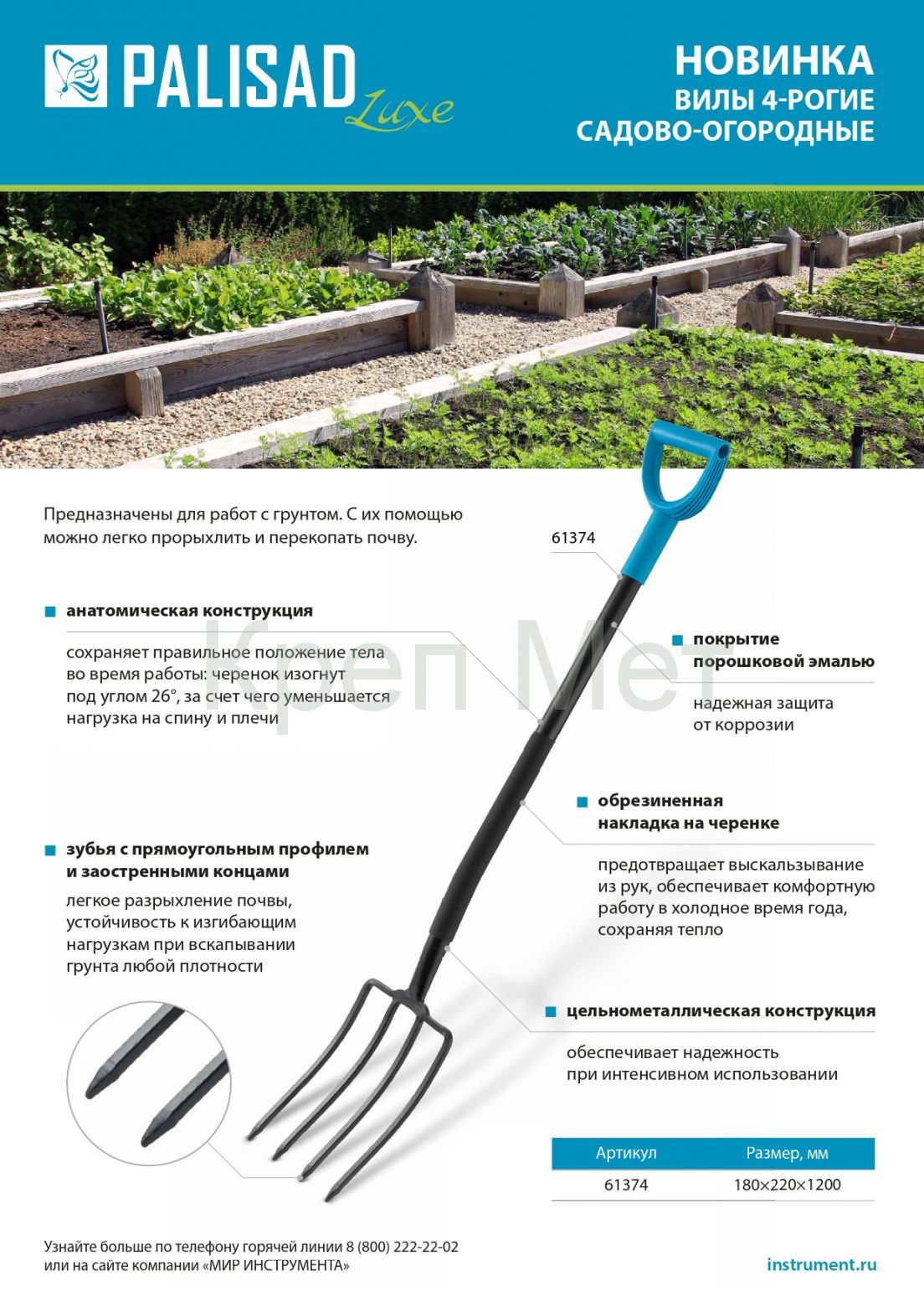 - Вилы 4-х рогие, садово-огородные, 180х280х1200 мм, цельнометаллические, кованые, LUXE Palisad